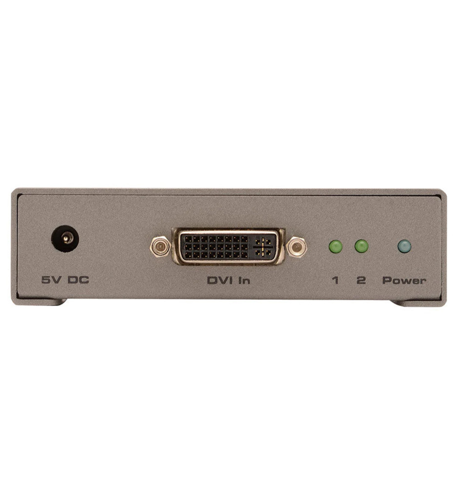 Na obudowie znajdują się wskaźniki LED informujące o zasilaniu i aktywnych połączeniach, co ułatwia konfigurację i diagnozowanie działania systemu. Kompaktowa obudowa i niskie zużycie energii sprawiają, że urządzenie można łatwo zintegrować z dowolnym systemem AV. W komplecie znajduje się kabel DVI Dual Link o długości 1,8 m oraz zasilacz 5 V DC, dzięki czemu urządzenie można uruchomić od razu po rozpakowaniu.
