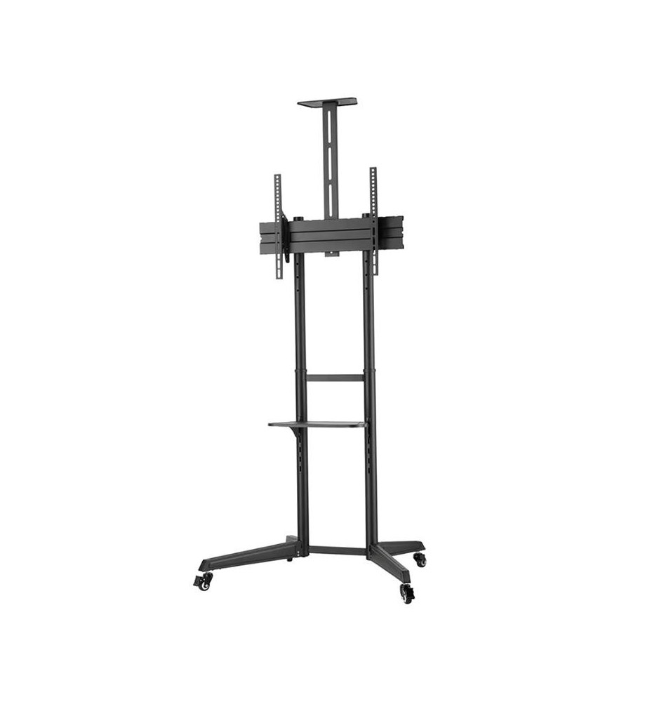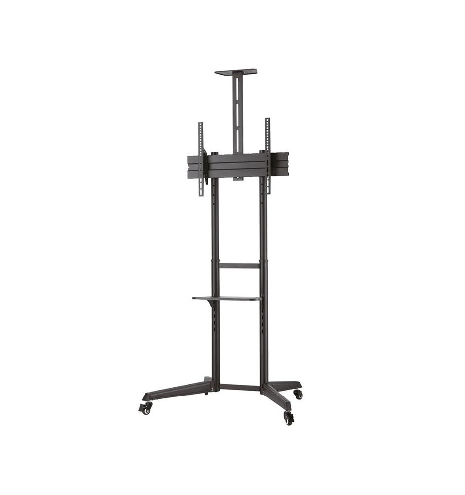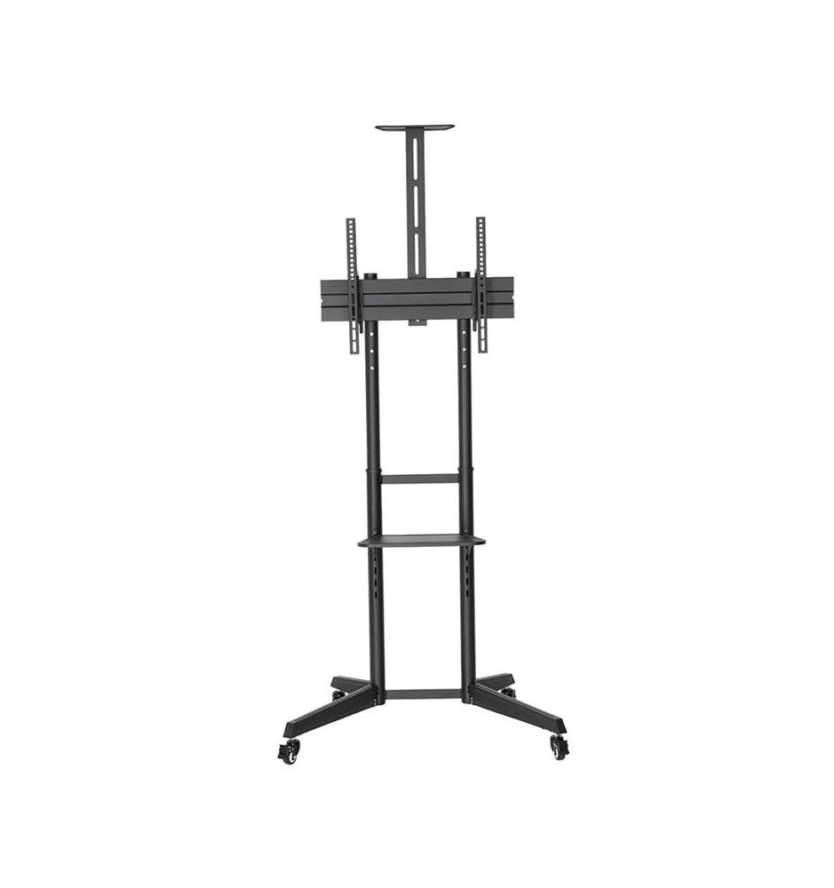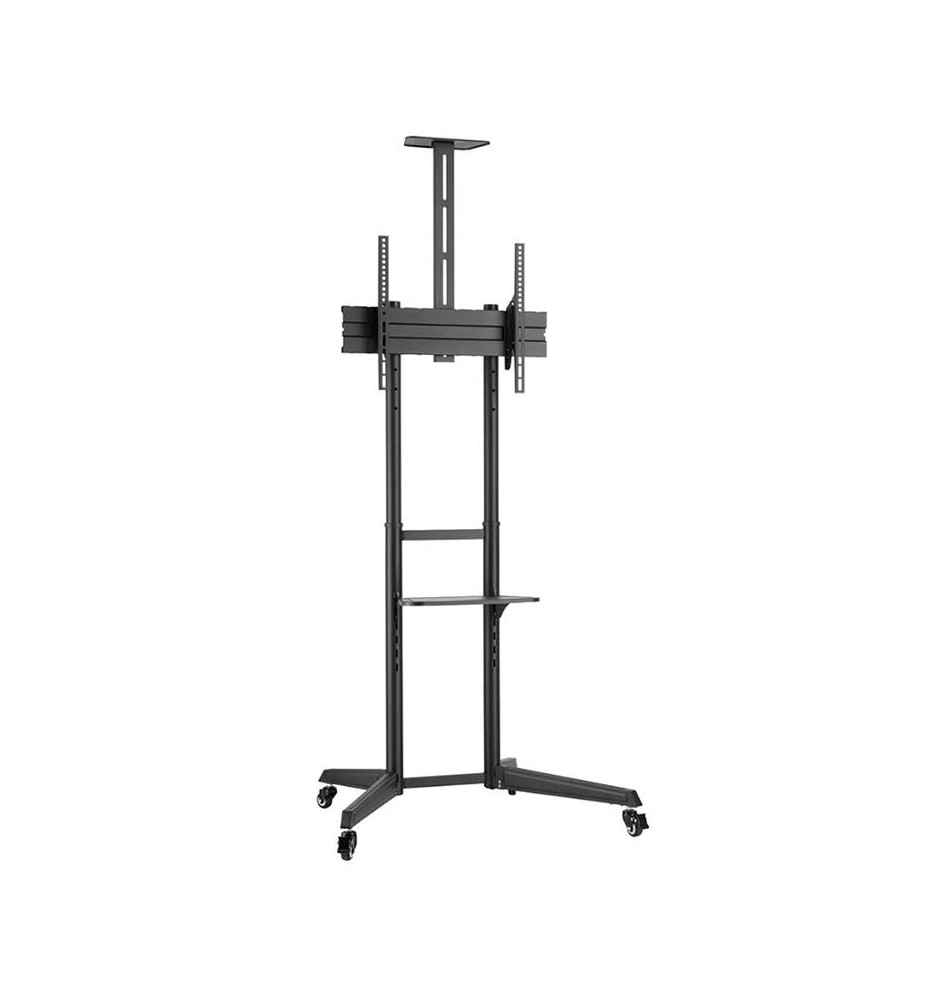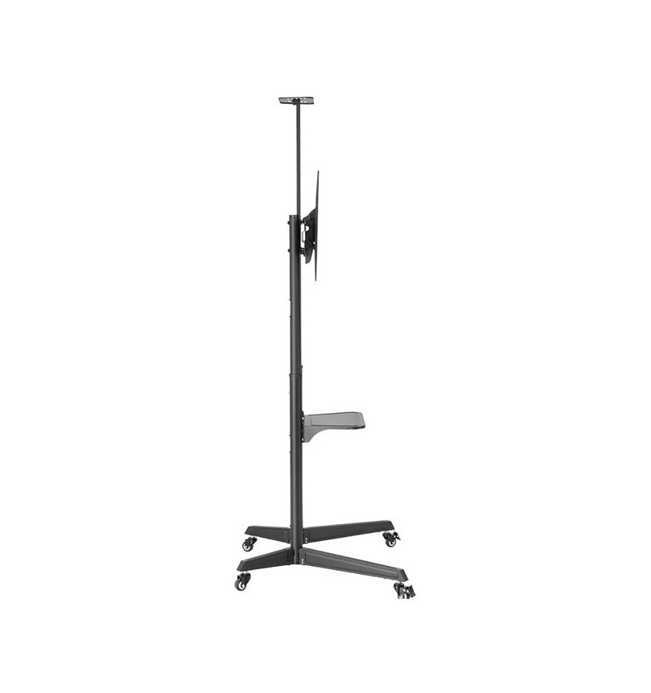 Wysokiej mobilności stojak do płaskich ekranów wyposażony w dodatkowe półki na akcesoria multimedialne oraz kamerę. Jest kompatybilny z ekranami o przekątnych w przedziale od 37" do 70". Pozwoli zaoszczędzić miejsce na ścianie czy suficie oraz łatwo przemieszczać monitor z jednego pomieszczenia do drugiego. Jest to możliwe dzięki skrętnym kółkom, które dodatkowo posiadają hamulce umożliwiające zatrzymanie stojaka w miejscu.