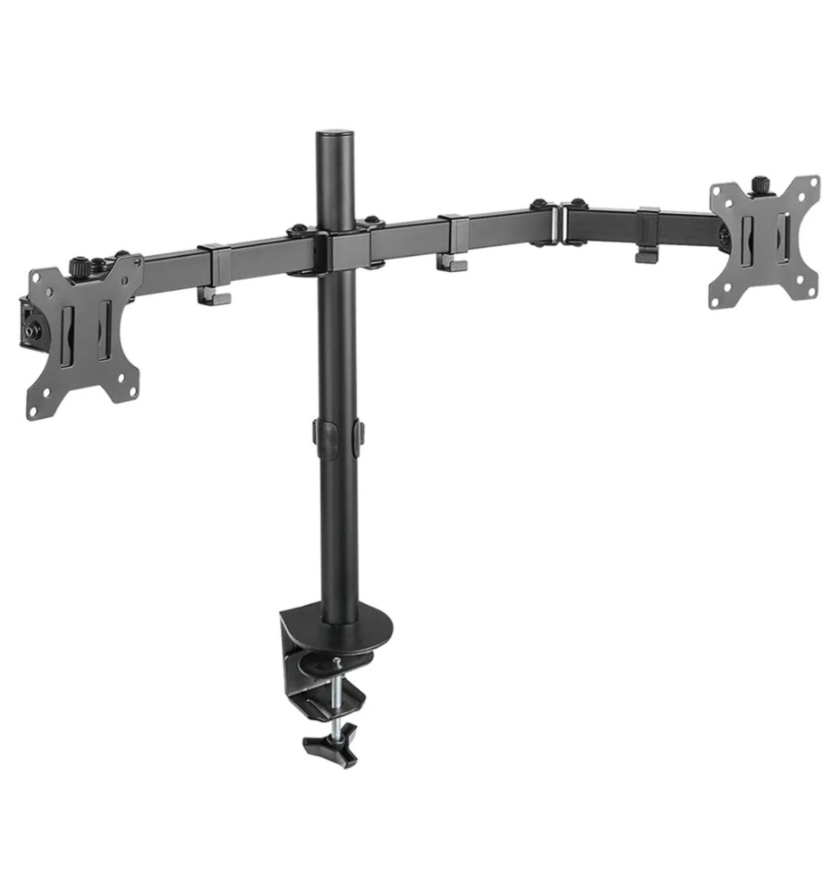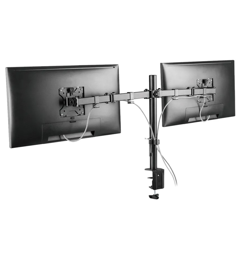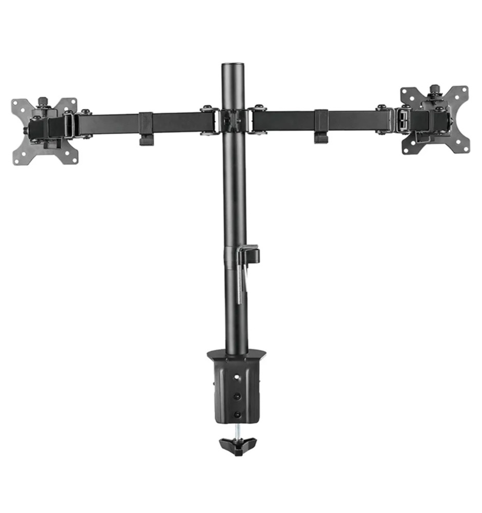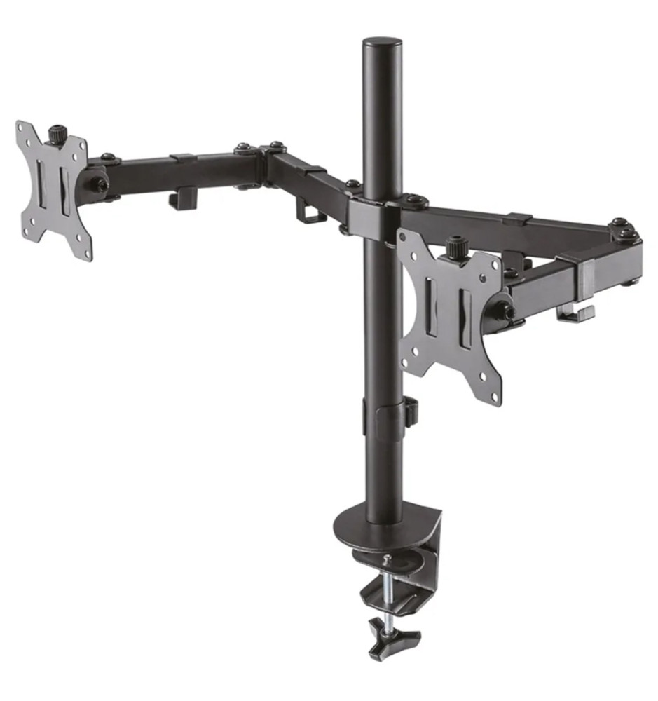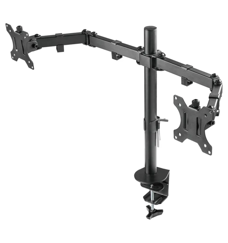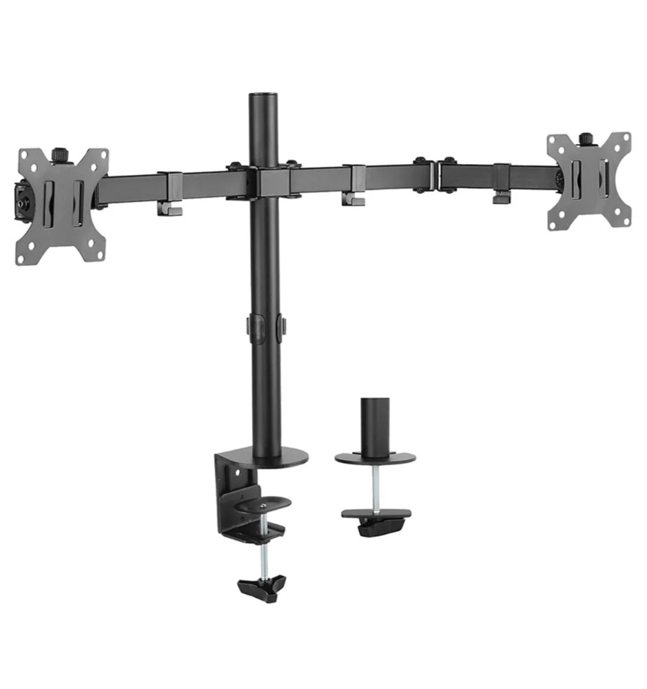 Profesjonalny uchwyt biurkowy dedykowany do dwóch monitorów komputerowych o przekątnej ekranu od 10" do 32". Dołączone akcesoria montażowe pozwalają na instalację uchwytu przelotowo do blatu biurka lub za pomocą zacisku.