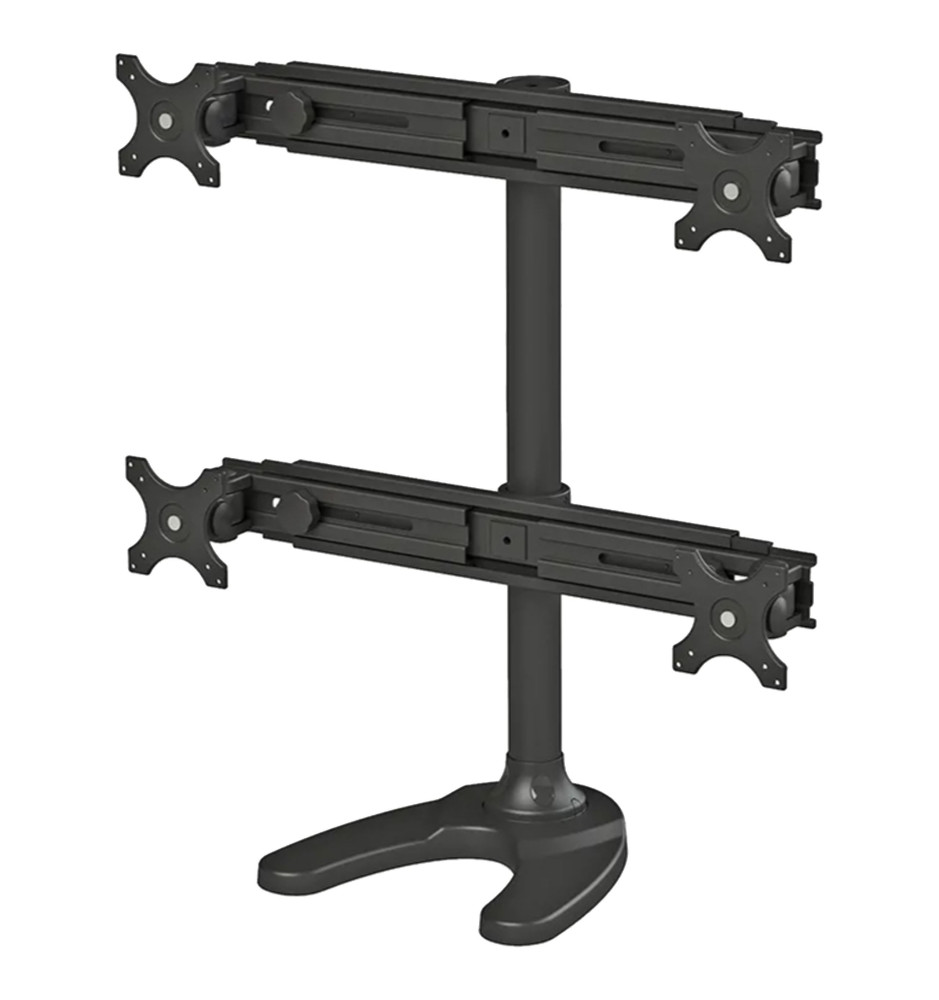 Profesjonalny, wytrzymały stojak biurkowy, dedykowany do zamontowania czterech płaskich monitorów komputerowych o przekątnej ekranu od 19" do 30". Może być ustawiony na blacie (dzięki dołączonej stopce) lub zainstalowany przelotowo. Szeroki zakres regulacji samego stojaka oraz uchwytów osobno dla każdego z monitorów, pozwala na stworzenie komfortowego miejsca pracy.