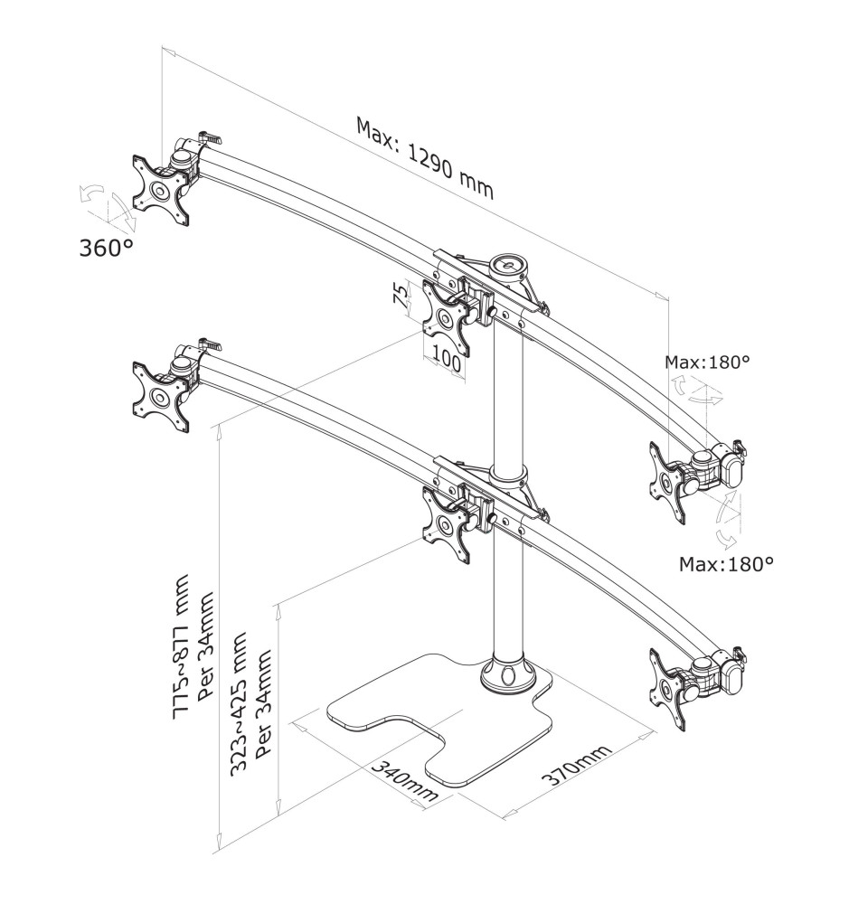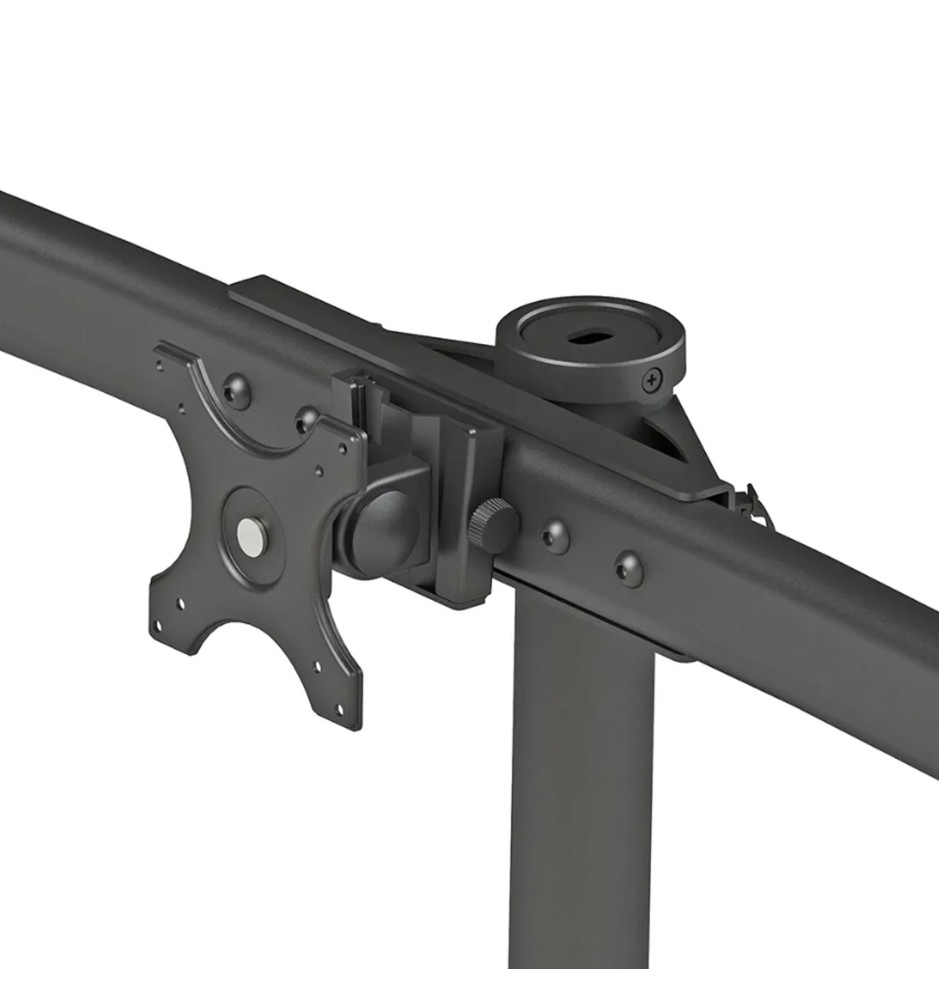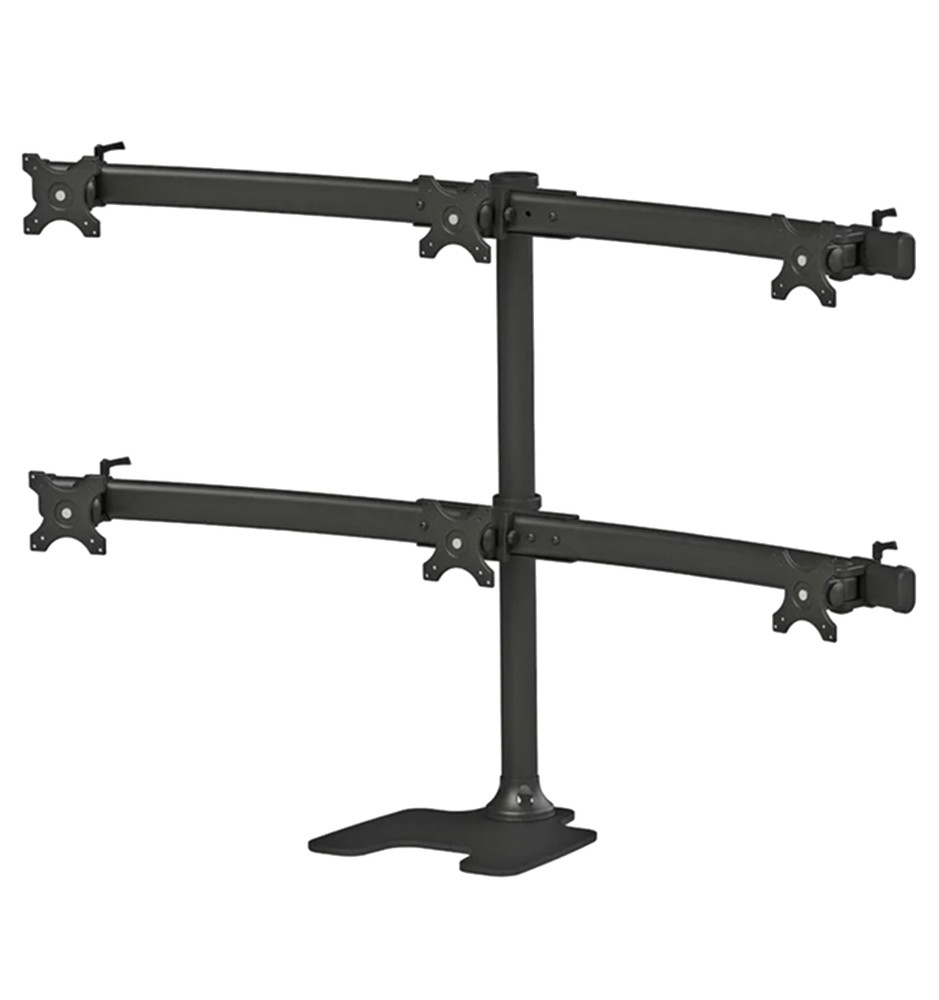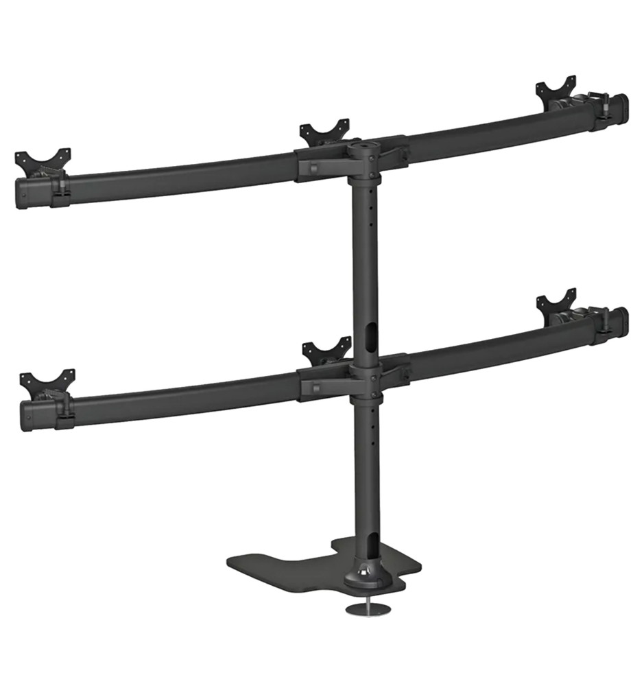Specjalistyczny stojak biurkowy z uchwytami na sześć płaskich monitorów komputerowych o przekątnej ekranu od 10" do 27". Może zostać ustawiony na blacie biurka (dzięki dołączonej stopce) lub zainstalowany przelotowo. Pozwala na stworzenie profesjonalnego stanowiska pracy.