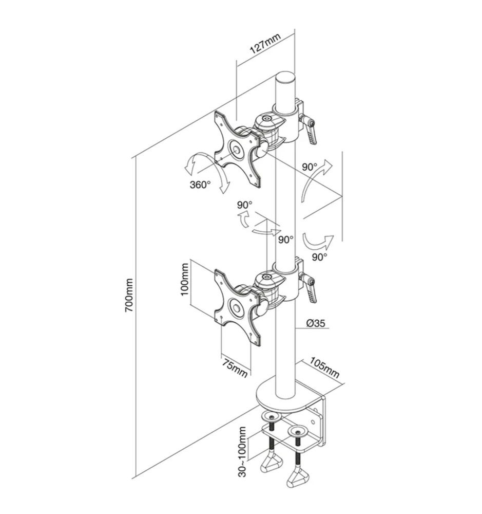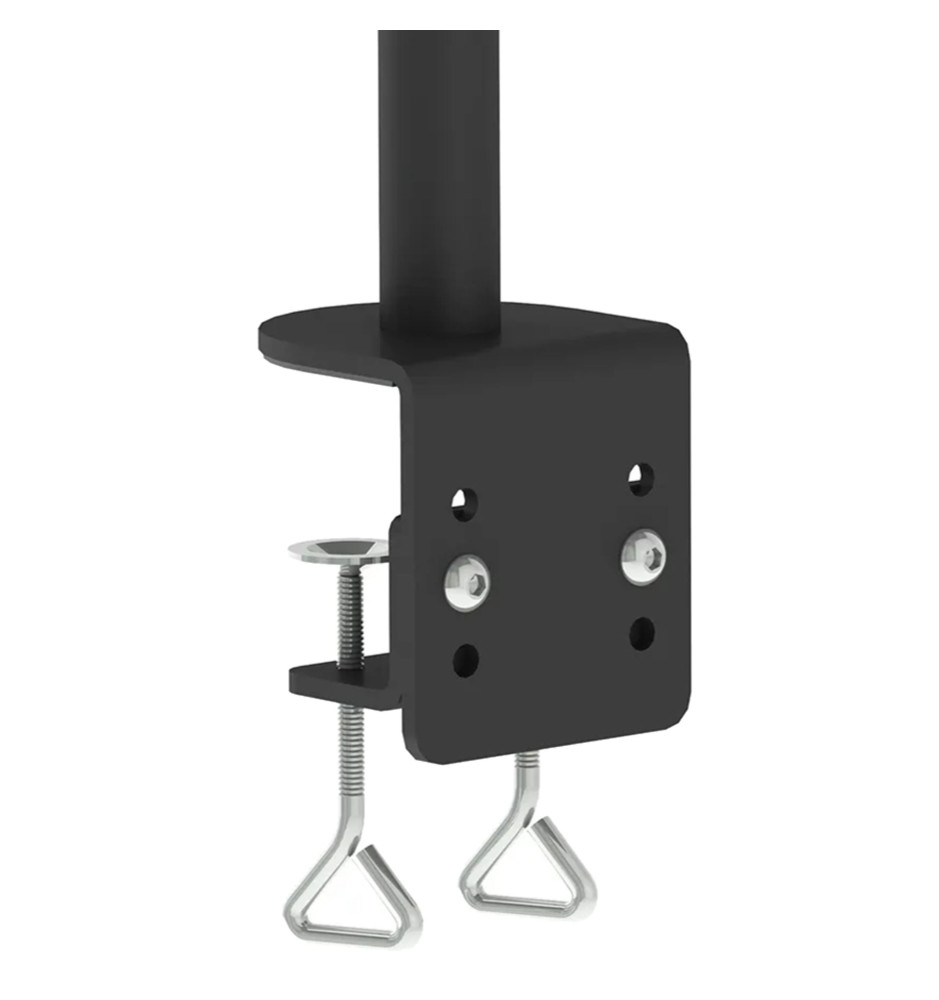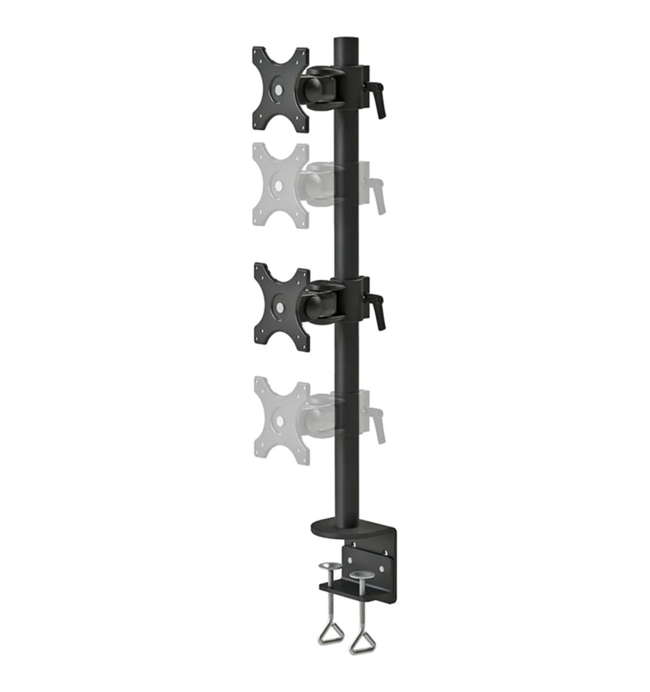 Bezinwazyjnie montowany do blatu za pomocą zacisków, profesjonalny stojak biurkowy z uchwytami na dwa płaskie monitory komputerowe, ustawione jeden nad drugim, o przekątnej ekranu od 10" do 27". Szeroki zakres regulacji uchwytów, indywidualnie dla obu monitorów, pozwala na stworzenie komfortowego miejsca pracy.