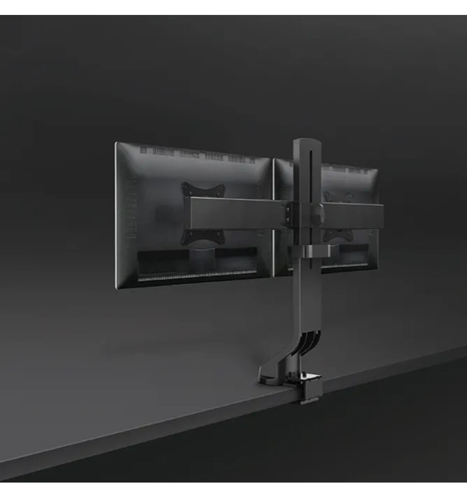 Profesjonalny, regulowany stojak biurkowy na dwa płaskie monitory komputerowe o przekątnej ekranu od 10" do 27". Dołączone do zestawu akcesoria instalacyjne pozwalają na bezinwazyjny montaż stojaka do blatu za pomocą specjalnego zacisku lub przelotowo (wymagane wykonanie otworu).