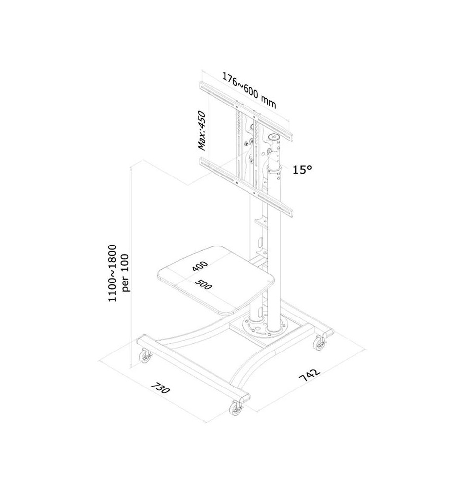 Mobilny stojak PLASMA-M1800E posiada otwory spełniające wymogi standardu montażowego VESA w zakresie od 200x200 do 600x450 mm. Umożliwia to używanie ekranów od przekątnych od 27" do 70". Niezbędne materiały instalacyjne do złożenia stojaka znajdują się już w opakowaniu wraz z produktem.