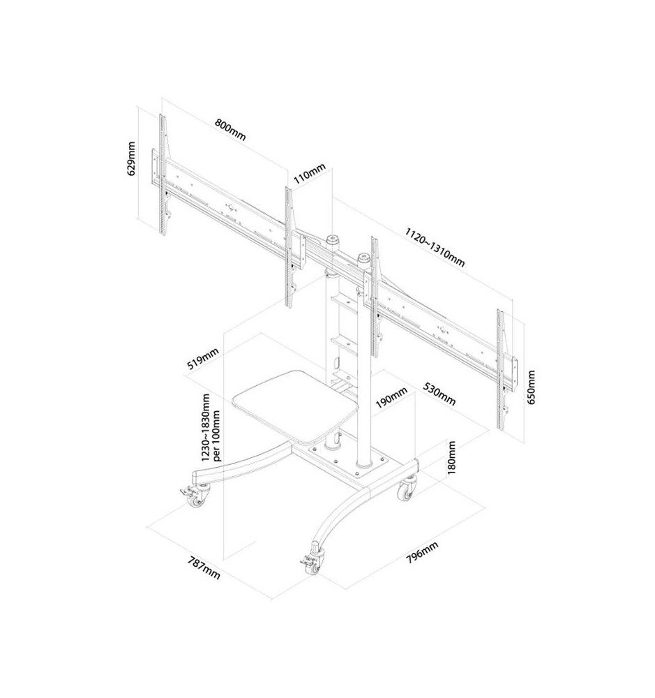 Mobilny stojak do stosowania z dwoma ekranami o przekątnych od 42" do 70". Dzięki zwrotnym kółkom bez problemu można go przestawiać w razie potrzeby z miejsca na miejsce. Uchwyt jest w stanie utrzymać obciążenie wynoszące 50 kg na ekran.