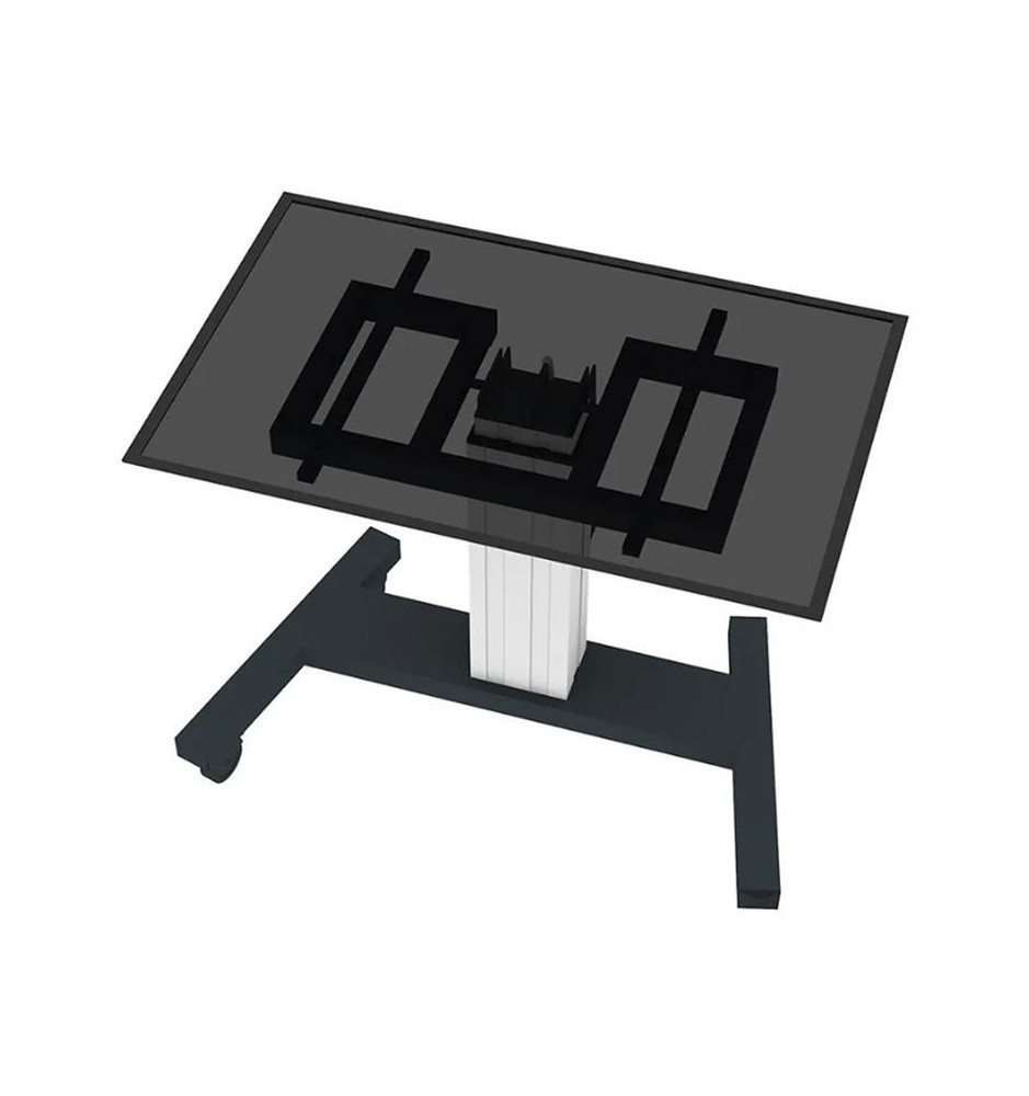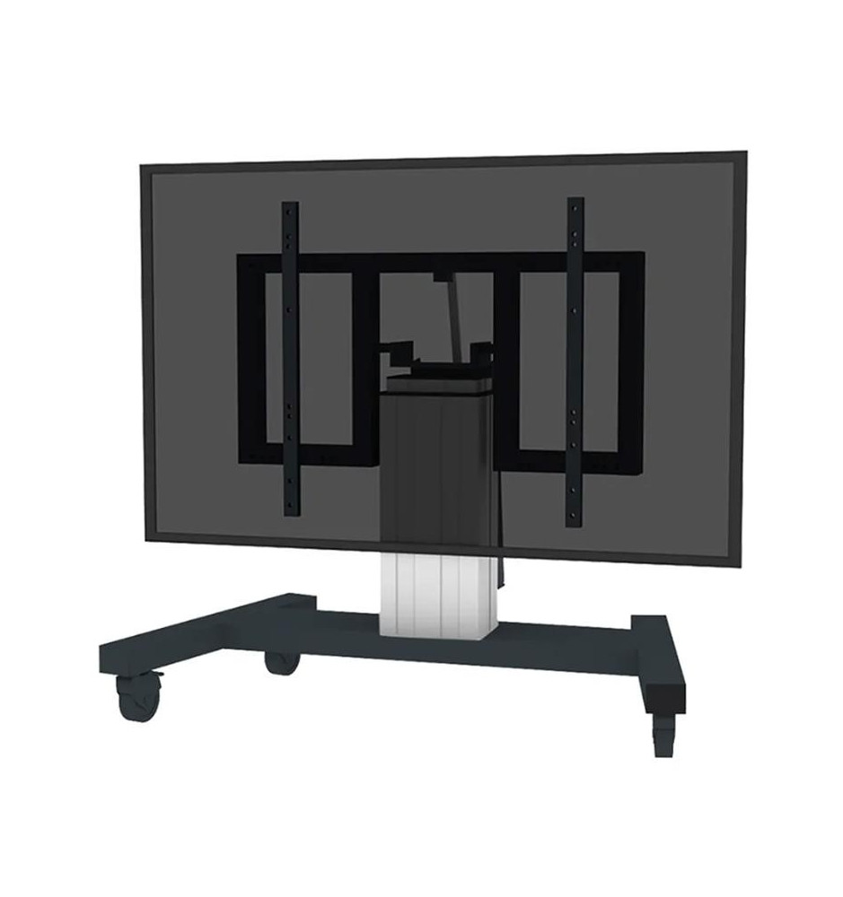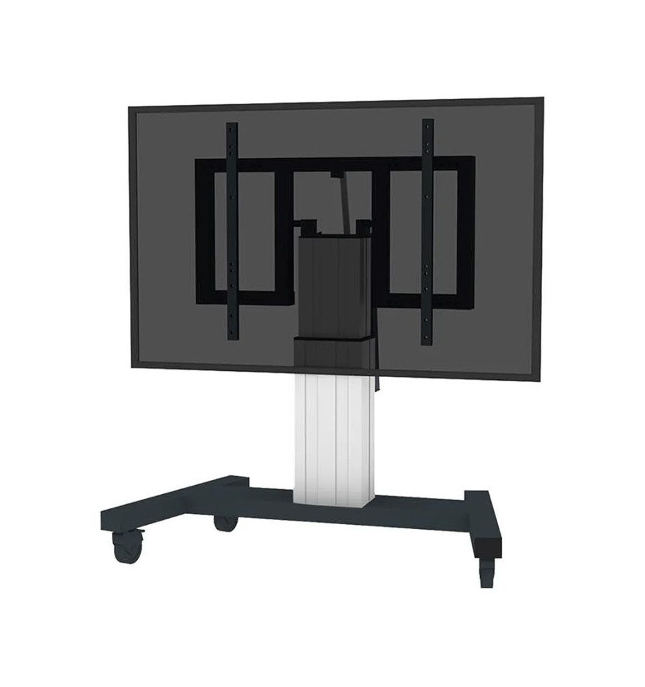 Mobilny stojak przeznaczony do użytkowania z ekranami o przekątnych w zakresie od 42" do 100". Prezentowany model został zaopatrzony w automatyczną regulację wysokości obsługiwaną przy pomocy dołączonego kontrolera.