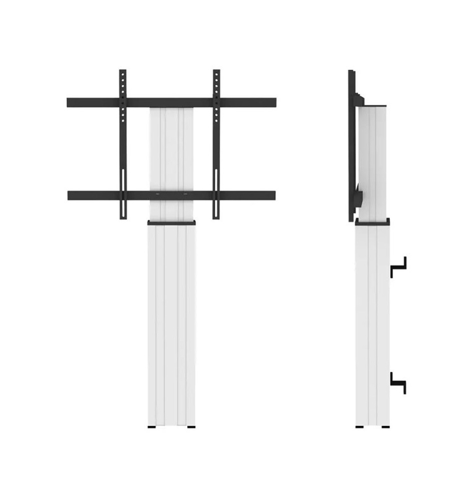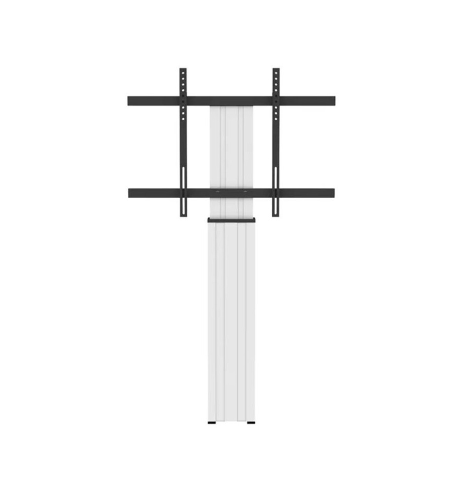 Uchwyt z wygodną, automatyczną regulacją wysokości. Kompatybilny z wielkoformatowymi płaskimi ekranami o przekątnych od 42" do 100". Może zostać umieszczony na podłodze i przymocowany do ściany za pomocą dołączonych uchwytów ściennych. Jego pozycję można idealnie wypoziomować za pomocą czterech regulowanych nóżek umieszczonych pod centralną kolumną.