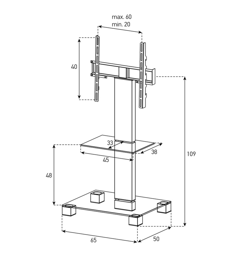 Wysokiej klasy stojak na telewizor o przekątnej ekranu od 32" do 50" i wadze do 50 kg, kompatybilny ze standardami VESA. Oferuje możliwość obrotu zamontowanego ekranu +/- 24 stopnie oraz jest wyposażony w szklaną półkę na sprzęty AV.