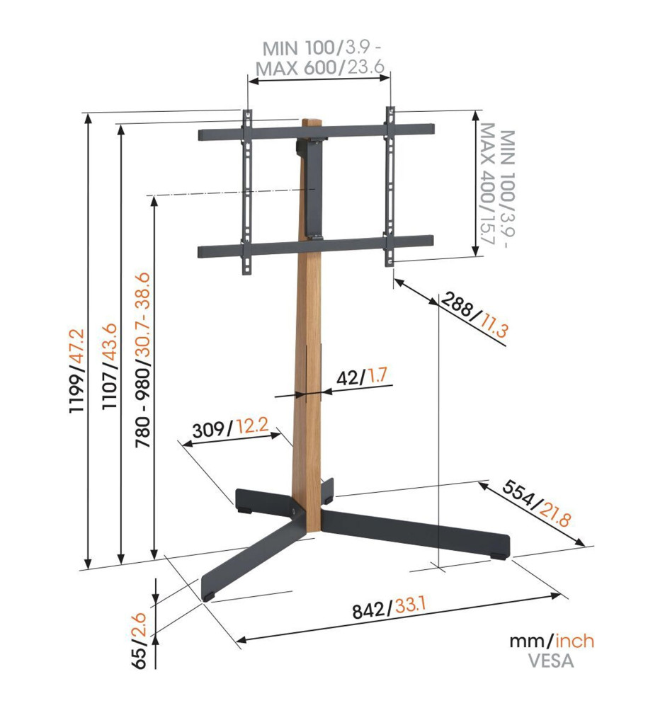 Wykonany z połączenia naturalnego dębowego drewna, certyfikowanego PEFC oraz najwyższej jakości stali, łatwy w ustawieniu i montażu, stylowy stojak podłogowy z serii Comfort, dedykowany do telewizorów o przekątnej ekranu od 40" do 77" i wadze do 50 kg. Zgodność ze standardami VESA od 100x100 do 600x400 gwarantuje kompatybilność z większością telewizorów.
