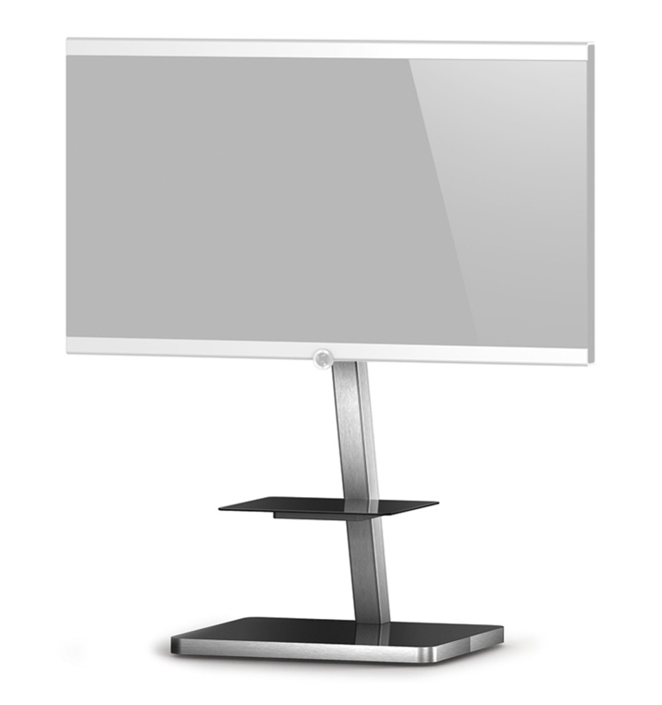 Idealny do każdego wnętrza, aluminiowy stolik RTV z obrotowym uchwytem do zawieszenia telewizora LCD o przekątnej ekranu od 32" do 52" oraz szklaną półką na sprzęt audio-video.