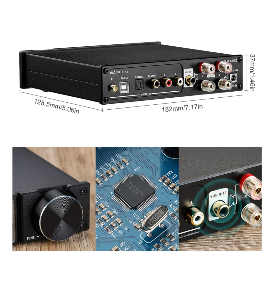 Dzięki zastosowaniu wysokiej klasy chipsetów CM6642, TAS5508, TAS5352A oraz innych, wzmacniacz AIYIMA D05 oferuje czysty dźwięk bez zniekształceń. Pasmo przenoszenia 20Hz–20kHz (±1dB) i współczynnik zniekształceń harmonicznych na poziomie jedynie 0,001% przy 1kHz sprawiają, że muzyka brzmi naturalnie i detalicznie.