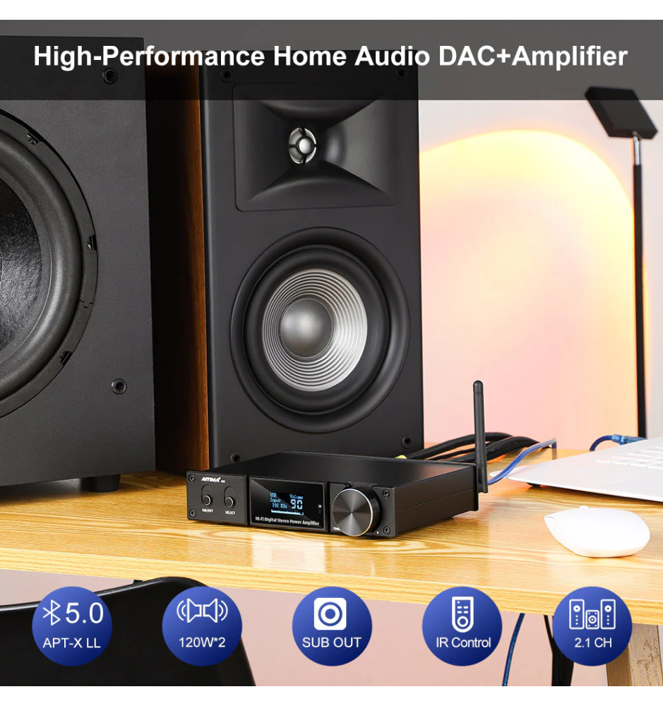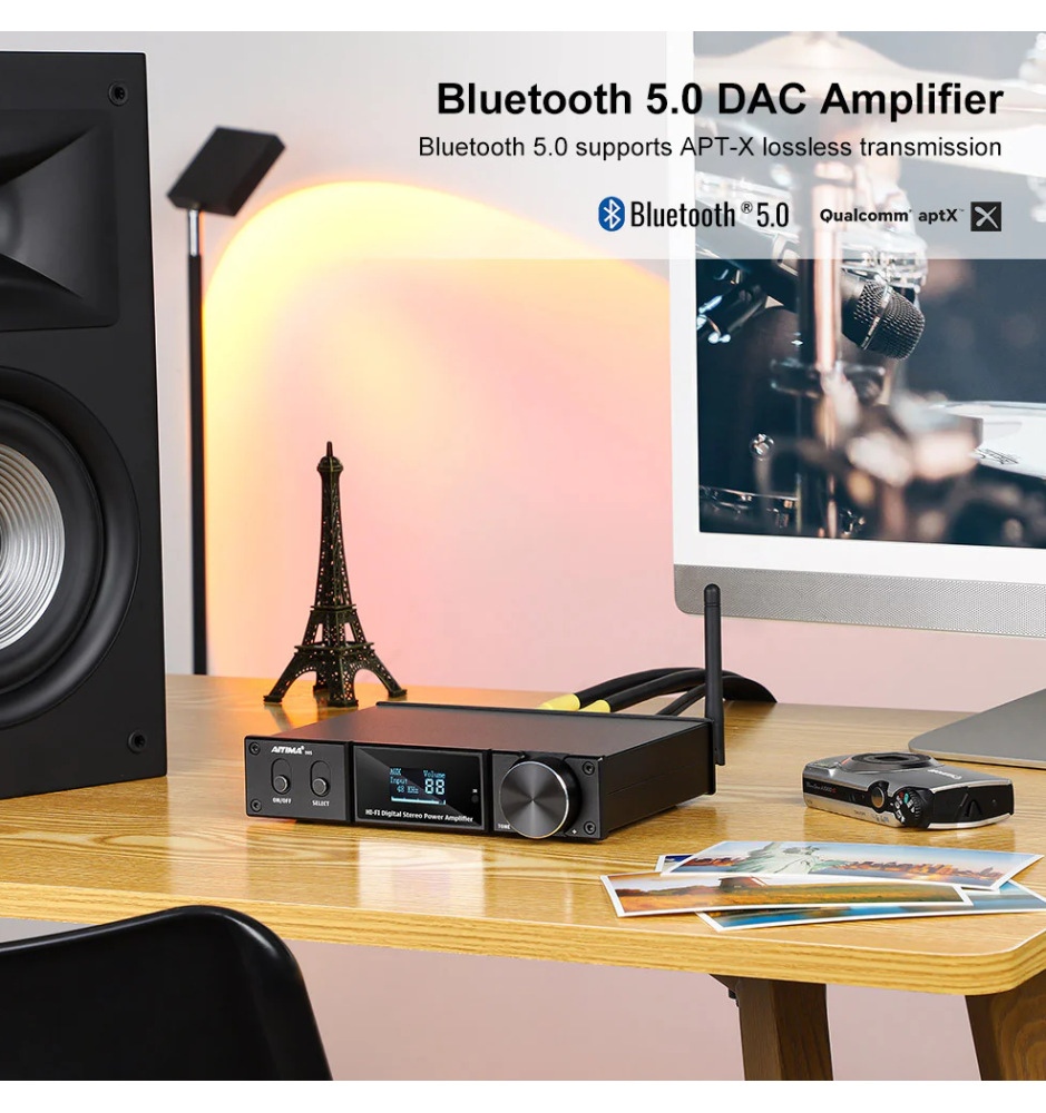 AIYIMA D05 to high-endowy wzmacniacz Hi-Fi 120W+120W z Bluetooth 5.0 aptX, szerokim pasmem 20Hz–20kHz, niskimi zniekształceniami 0.001% i wieloma wejściami audio.