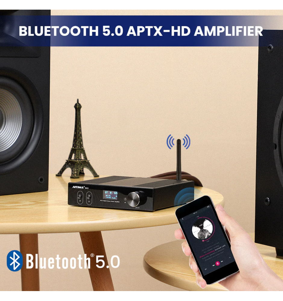 AIYIMA D05 wyposażony jest w Bluetooth 5.0 (QCC3031) z obsługą kodeków AAC, SBC, aptX i aptX LL. Dzięki temu możesz cieszyć się stabilnym połączeniem, niskim opóźnieniem i wysoką jakością dźwięku bez kabli.