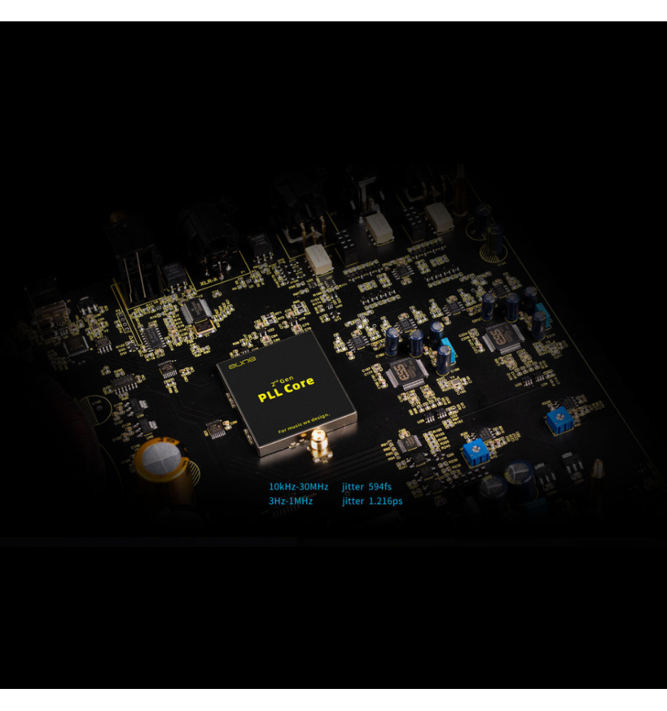 Drugie pokolenie rdzenia PLL to kluczowa poprawa jitteru — precyzyjny, ultra-niski jitter zapewnia spójność zegara dla USB, XMOS i DACów jednocześnie. S9c Pro oferuje również wejście 10 MHz dla zewnętrznego zegara, co otwiera możliwości dalszej poprawy jakości przy użyciu zewnętrznych generatorów taktowania.