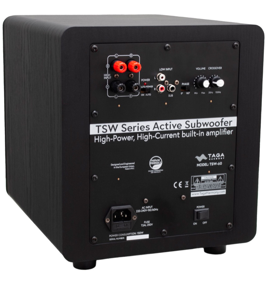 Subwoofer posiada gniazdo zasilania IEC C14 oraz dołączony wymienny przewód zasilający Schuko-IEC C13, który zapewnia lepsze filtrowanie oraz stabilne zasilanie. Dołączony przewód można wymienić, w łatwy sposób podnosząc jakość systemu. Dodatkowo do TSW-60 producent dołącza kabel subwooferowy RCA-RCA oraz stylową maskownicę.