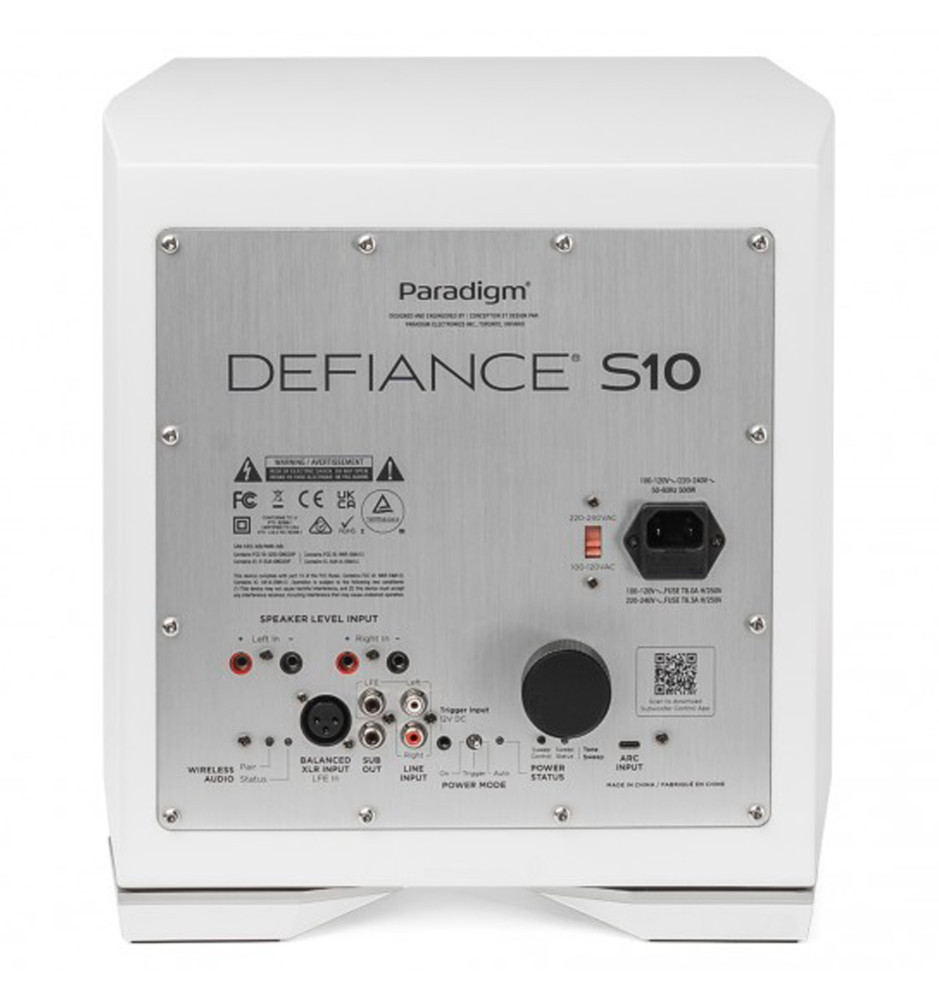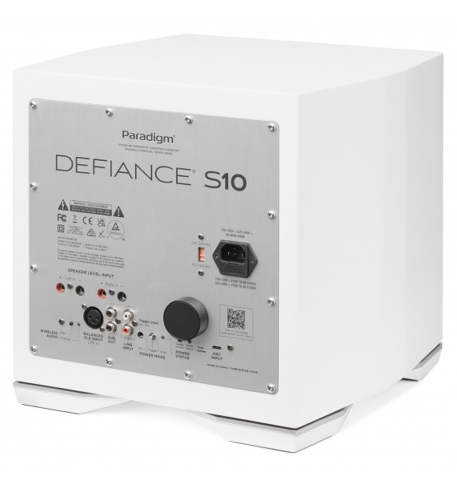 Defiance S10 został wyposażony we wzmacniacz Ultra Class-D o mocy 500 W RMS (1000 W szczytowej) oraz 10-calowy (254 mm) przetwornik niskotonowy S-PAL™ z anodowanego aluminium, co przekłada się na dynamiczny, czysty bas bez nadmiernych wibracji. Subwoofer charakteryzuje się pasmem dolnego zakresu sięgającym 18 Hz, dzięki czemu nawet najniższe częstotliwości są odtwarzane z wyraźną kontrolą i głębią.