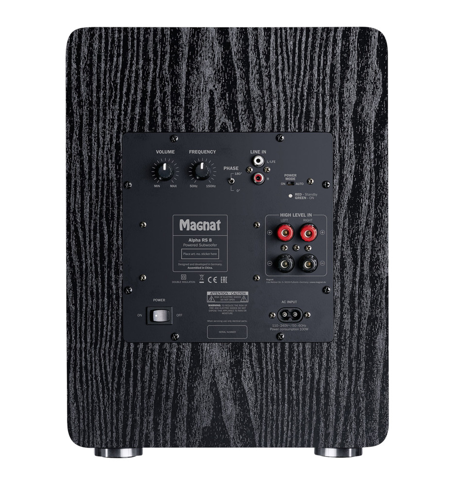 Magnat Alpha RS 8 umożliwia dokładne dopasowanie pracy do głównych kolumn poprzez regulację częstotliwości odcięcia (50–150 Hz) oraz fazy (0° / 180°). Subwoofer oferuje zarówno wejścia liniowe (RCA), jak i wejścia wysokopoziomowe (zaciski głośnikowe), dzięki czemu może współpracować z praktycznie każdym wzmacniaczem lub amplitunerem.