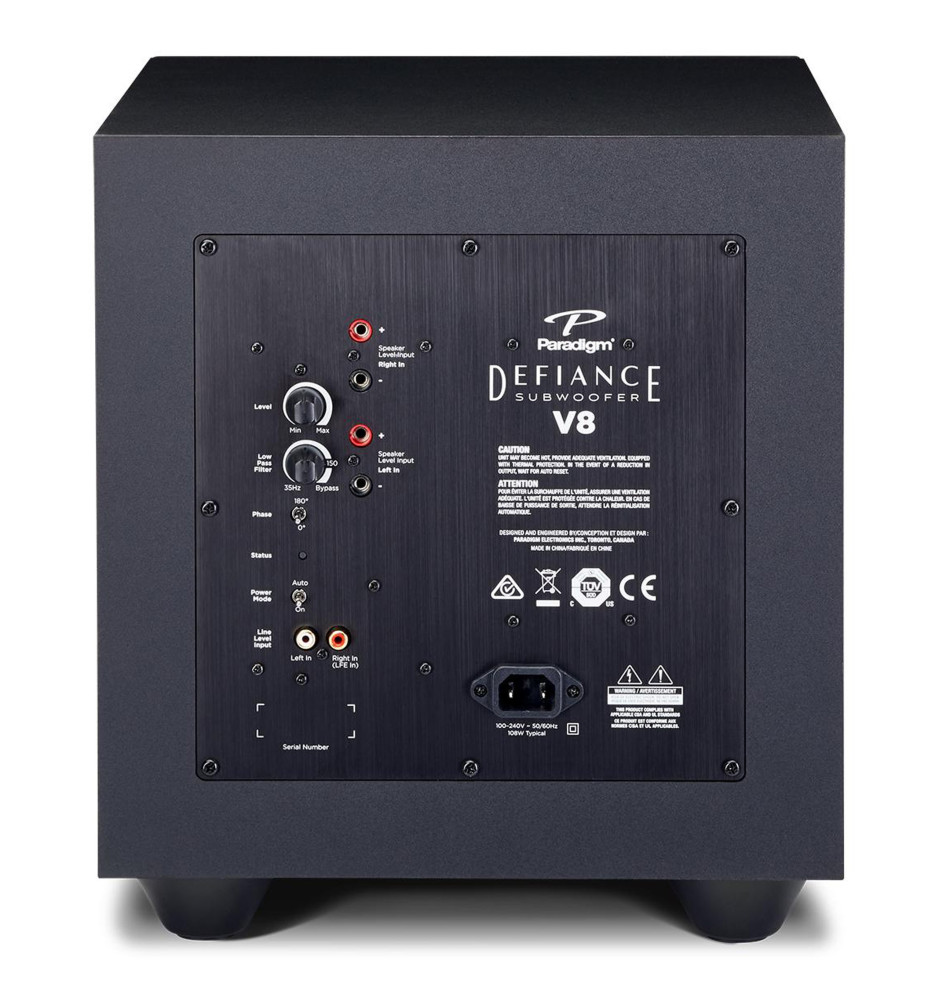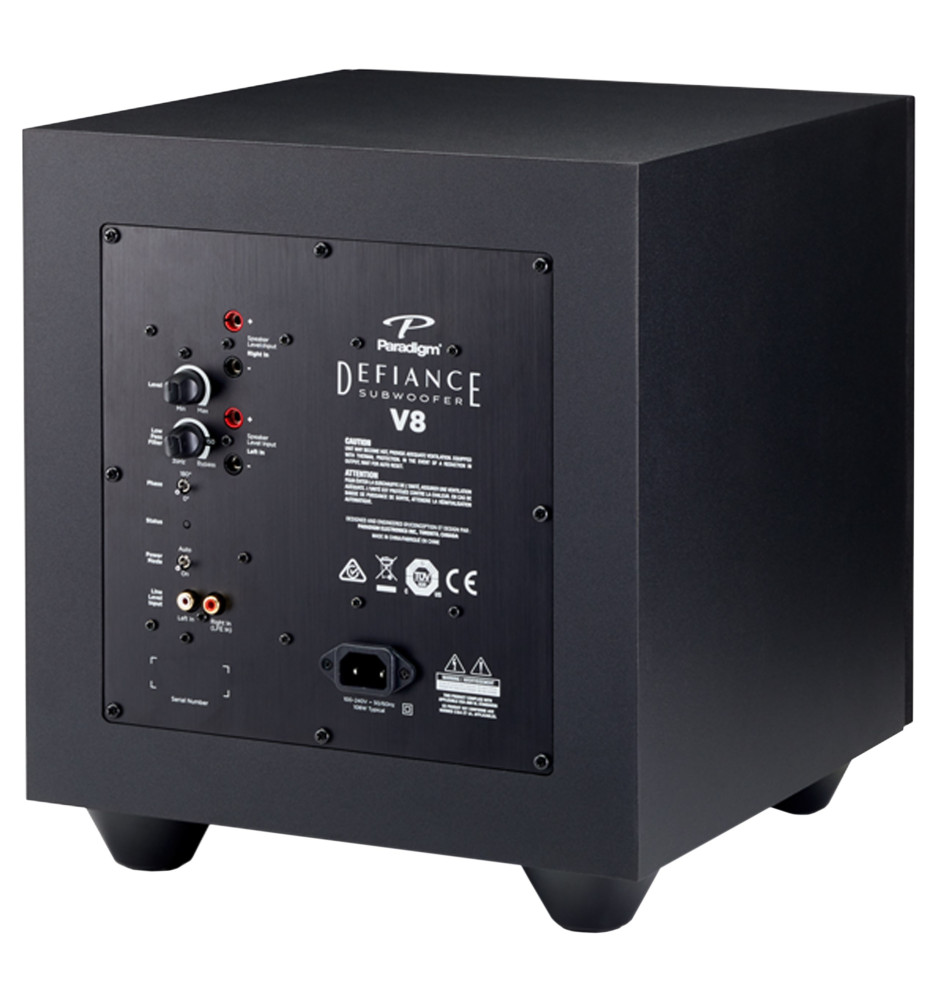 Subwoofer Paradigm Defiance V8 cechuje się niedużymi gabarytami i zastosowaniem wydajnego 8-calowego przetwornika niskotonowego wykonanego z polipropylenu wzbogaconego węglem. Wbudowany wzmacniacz klasy D generuje 75W mocy wyjściowej (aż 150W mocy szczytowej). V8 sprawdzi się w niedużych pomieszczeniach jako rozszerzenie systemu stereo lub niewielkiego zestawu kina domowego.