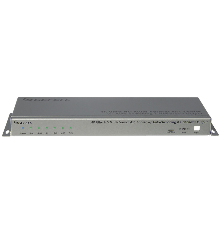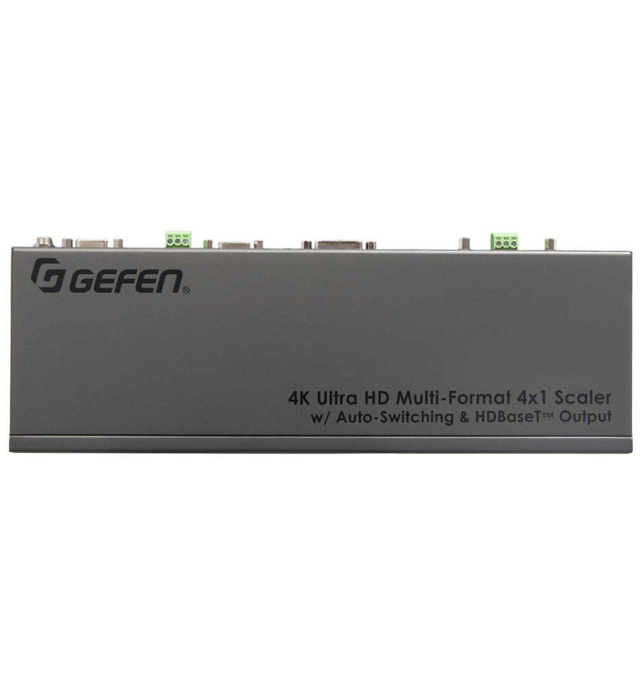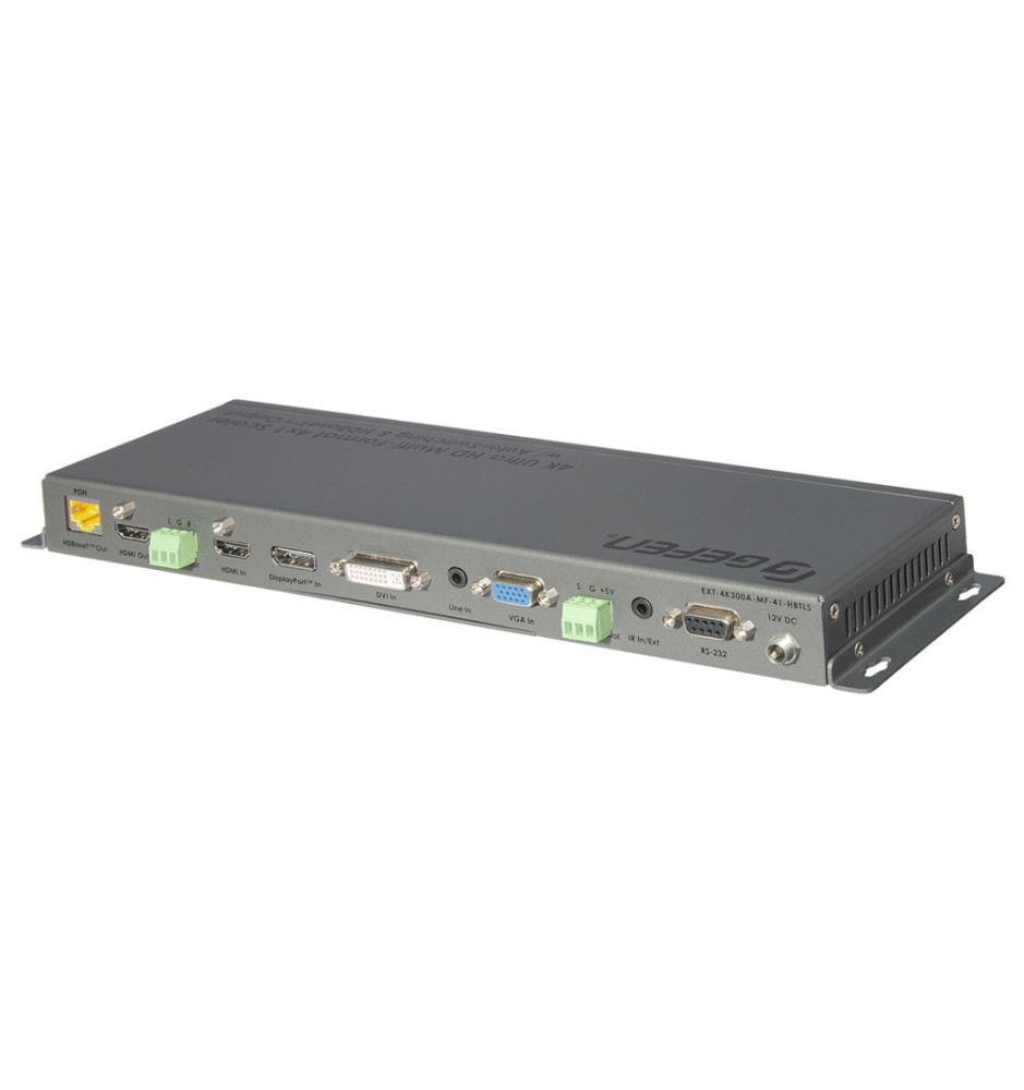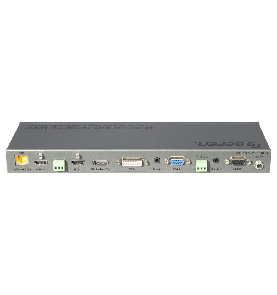 Gefen EXT-4K300A-MF-41-HBTLS to urządzenie, które pozwala na automatyczne przełączanie obrazu 4K Ultra HD z HDMI, 4K z DisplayPort oraz z portów DVI i VGA ze skalowaniem do WUXGA oraz 1080p Full HD.