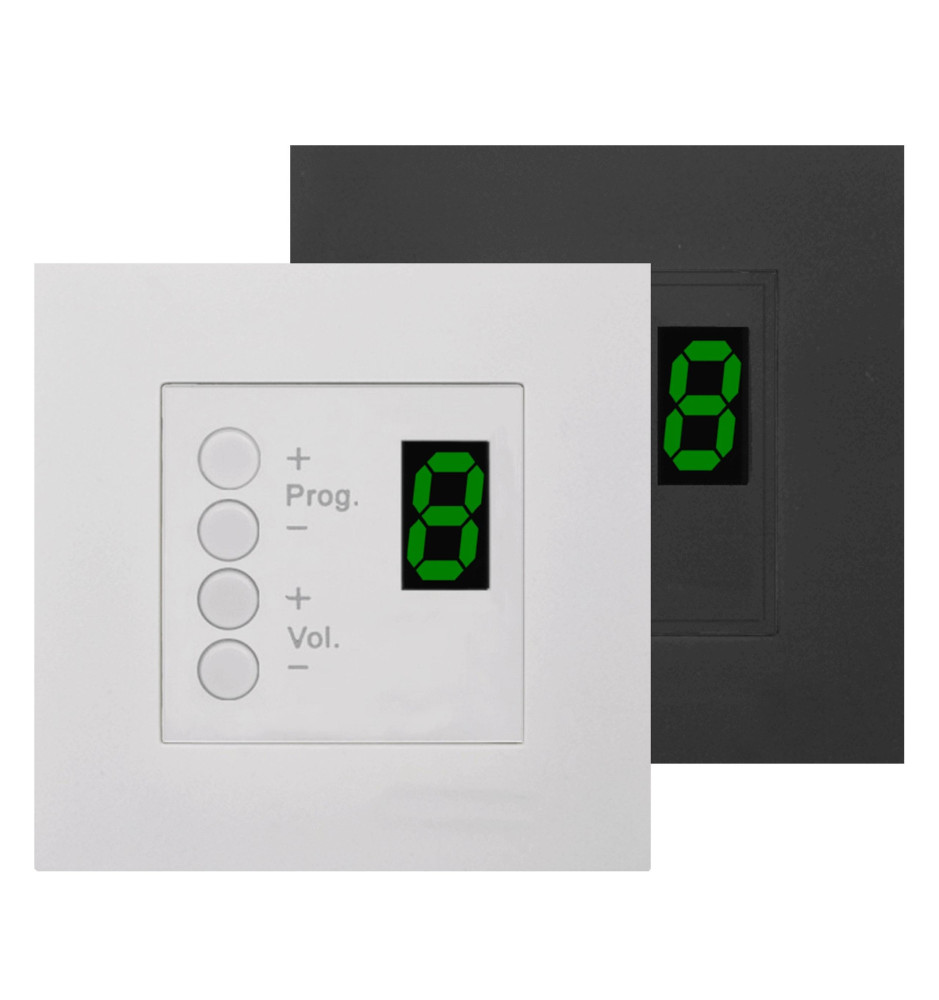 Kontroler ścienny do zabudowy podtynkowej, który po zainstalowaniu w strefie daje możliwość wyboru źródła audio oraz regulację głośności.
