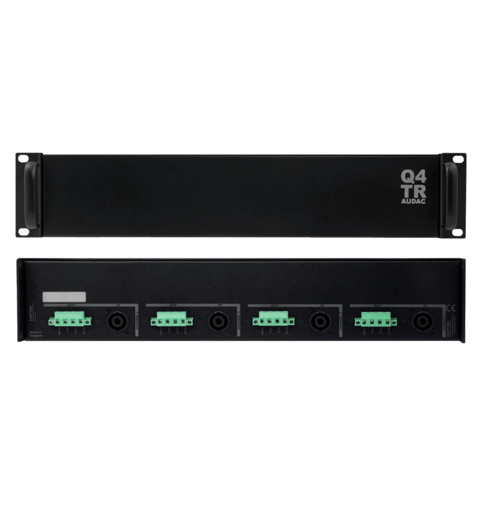 Audac Q4TR to transformator liniowy zaprojektowany z myślą o użytkowaniu go w połączeniu z czterokanałowym wzmacniaczem mocy Q4. Jego zadanie polega na przekształcaniu niskoimpedancyjnego sygnału wyjścia głośnikowego do używania w stałonapięciowych systemach dystrybucji dźwięku stosowanego w instalacjach 100 V, 70 V lub 50 V.