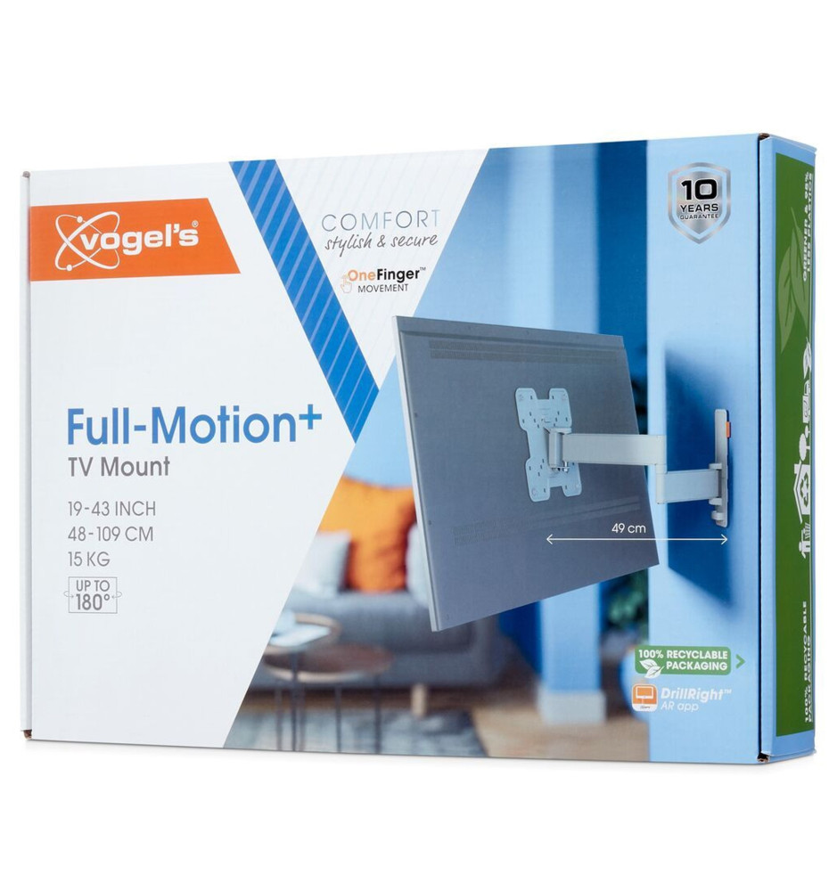 Stylowy i wytrzymały uchwyt ścienny typu Full-Motion+ z serii Comfort z długim ramieniem o szerokim zakresie regulacji obrotu i pochylenia, dedykowany do mniejszych telewizorów o przekątnej ekranu od 19" do 43" i wadze do 15 kg.