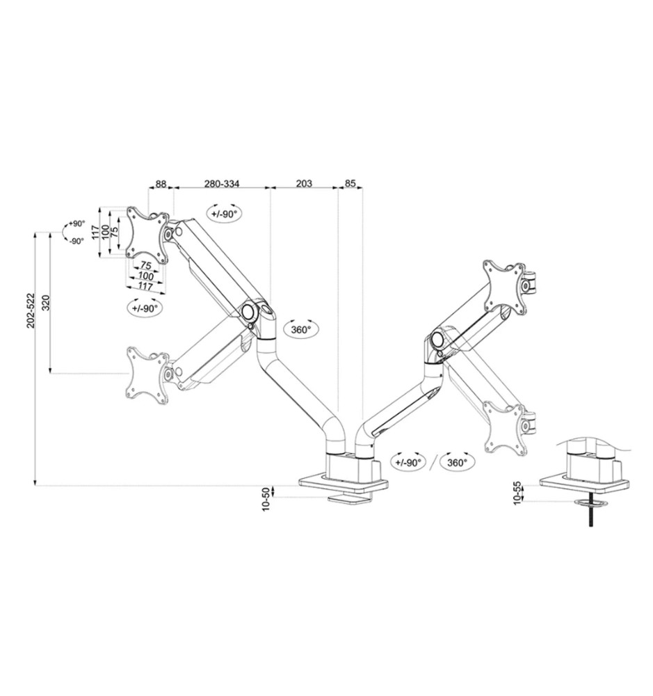 Ten wyjątkowo praktyczny uchwyt pozwoli na zaoszczędzenie w przestrzeni roboczej miejsca, które normalnie zajęłyby dwa w pełni wymiarowe monitory stojące na tradycyjnych nóżkach. Ekrany można zainstalować korzystając ze standardowych otworów montażowych w standardzie VESA 75x75 i 100x100. Dzięki temu, że każde z ramion można wyregulować osobno w szerokim zakresie, będziesz w stanie przyjąć najbardziej optymalną pozycję podczas pracy czy rozrywki.