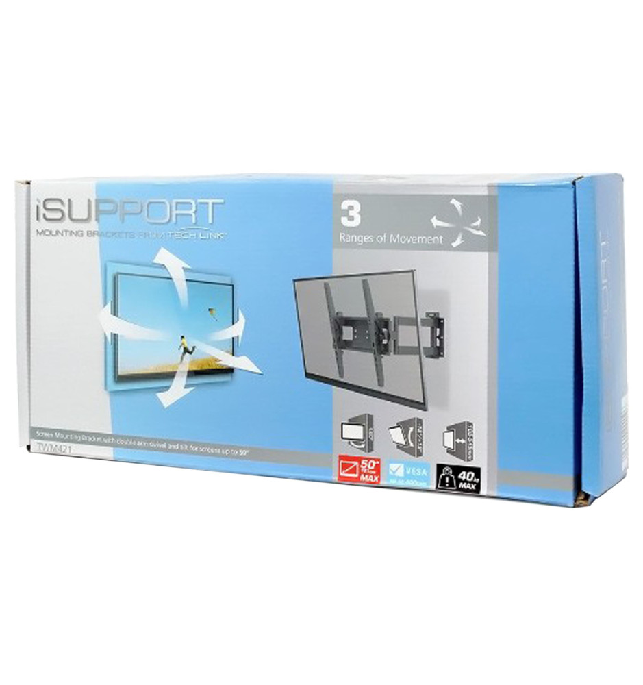 Uniwersalny uchwyt do telewizorów TechLink TWM421 został wykonany z wysokogatunkowej stali, gwarantującej bezpieczny montaż oraz wieloletnie bezawaryjne użytkowanie. Dzięki dwuczęściowemu ramieniu, posiada regulację odległości od ściany od 60 mm (złożony na płasko) do 473 mm. Dodatkowo oferuje regulację nachylenia w zakresie -10° do 20°, obrotu w zakresie +/- 90° i regulację poziomu +/- 3°.
