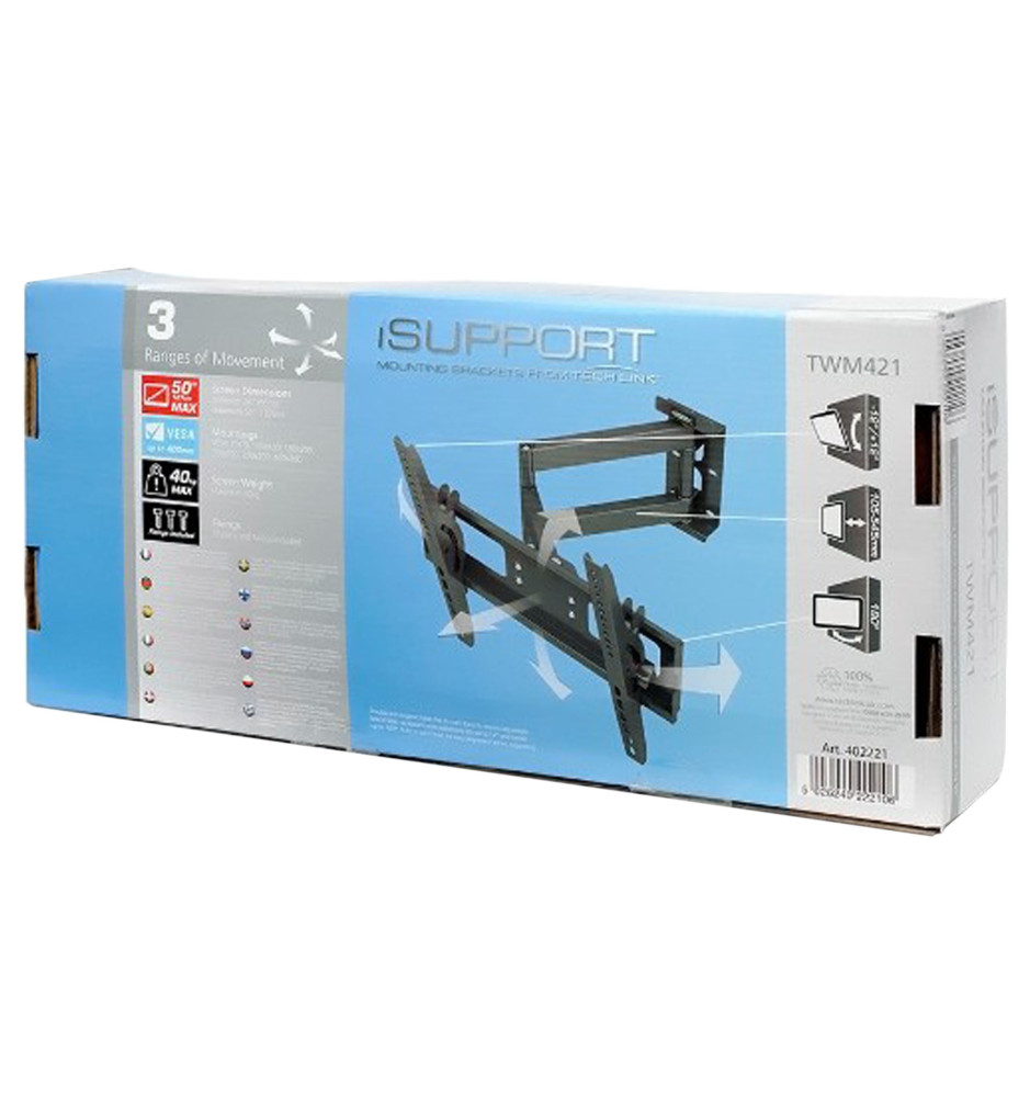 Uniwersalny uchwyt ścienny o podwójnym ramieniu, dedykowany do telewizorów o przekątnej ekranu od 26" do 70" i wadze do 50 kg. Uchwyt TWM421 jest kompatybilny z rozstawem otworów montażowych w standardzie VESA do 400x400mm.