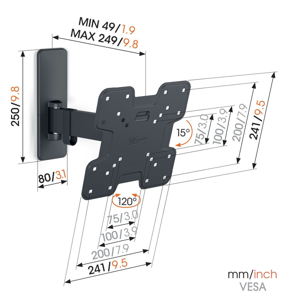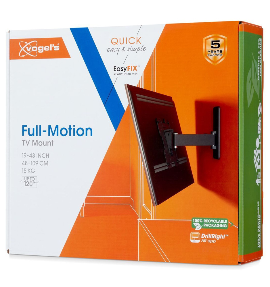 Wysokiej jakości uchwyt ścienny z serii Quick z ramieniem o szerokim zakresie regulacji, dedykowany do mniejszych telewizorów o przekątnej ekranu od 19" do 43" oraz wadze do 15kg. Pozwala na płynne obrócenie ekranu w zakresie do 120° oraz jego pochylenie do 15°.