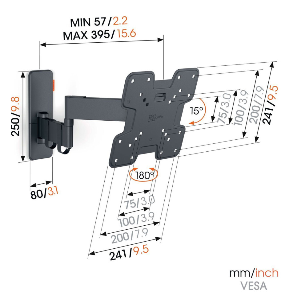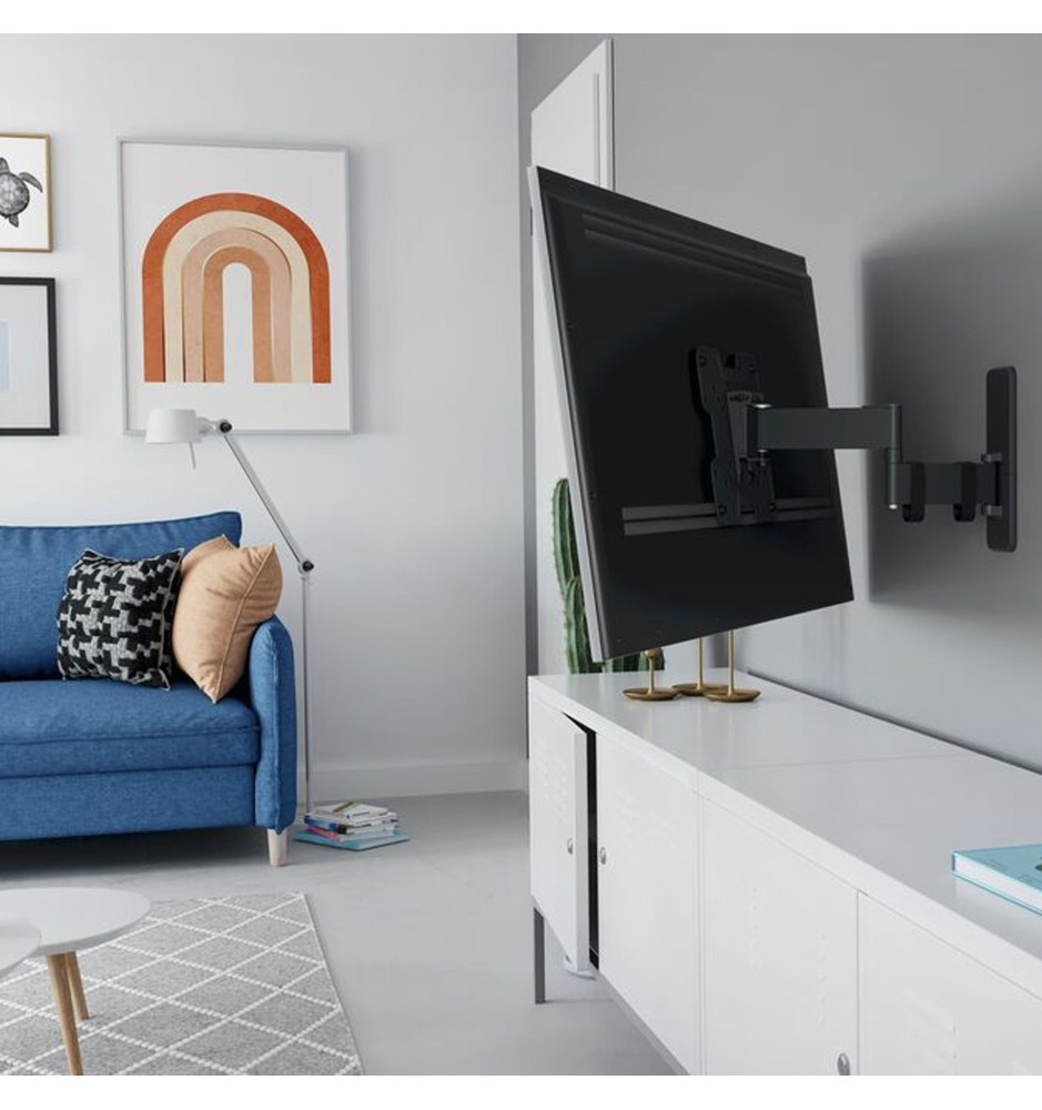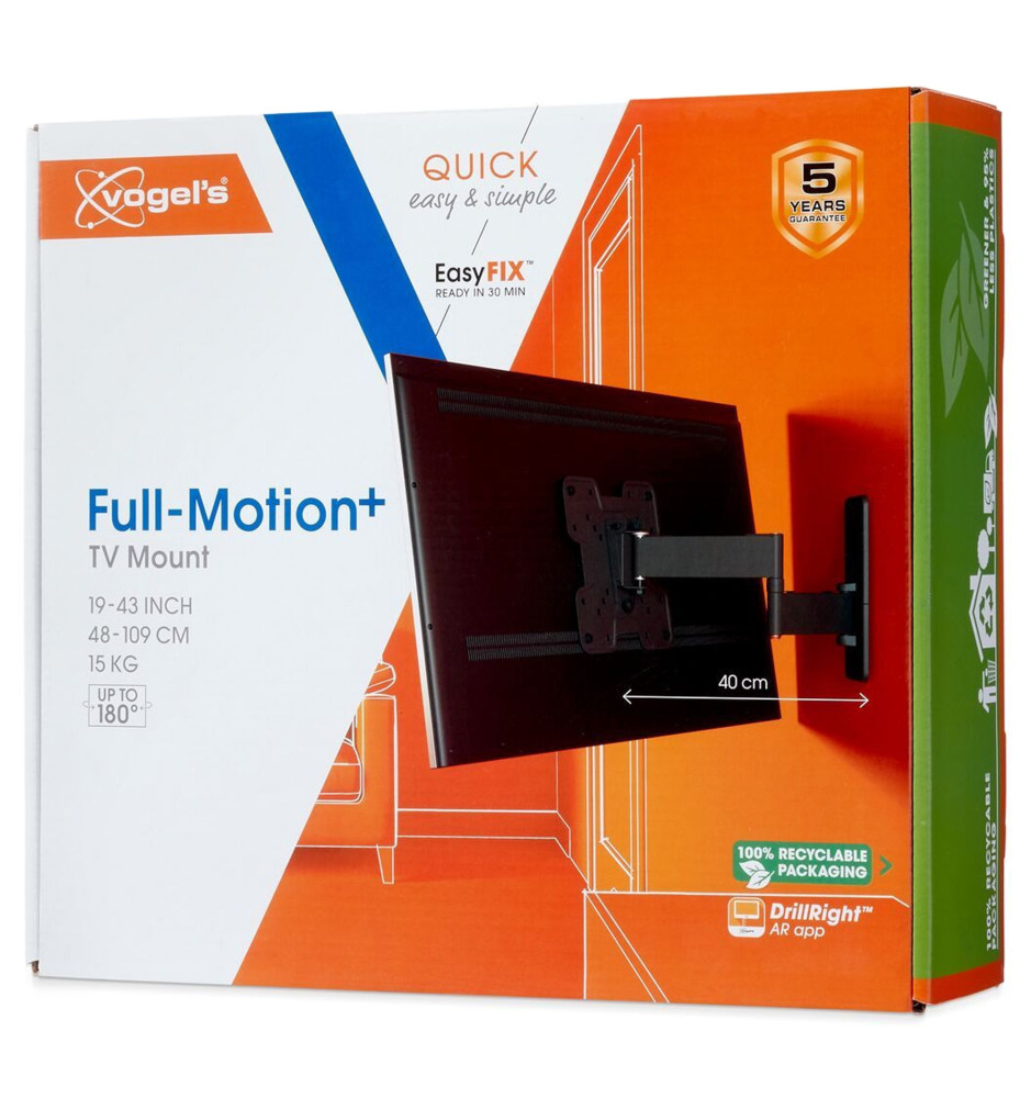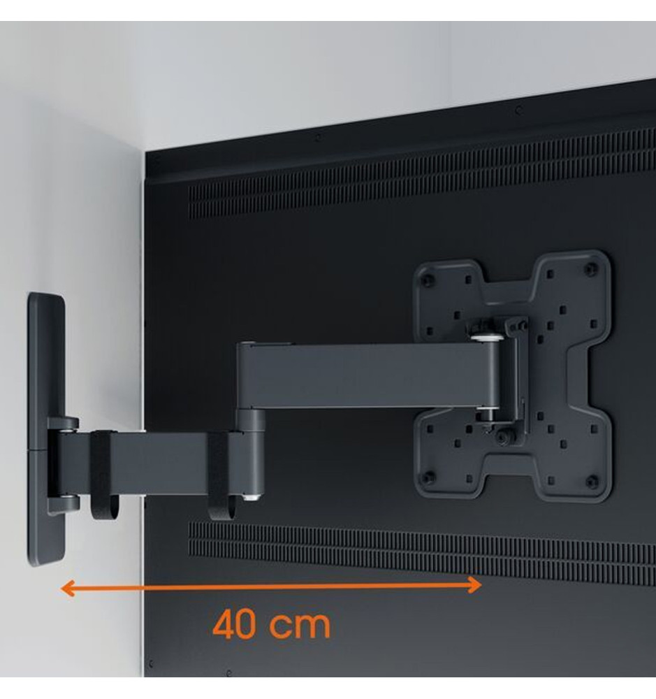 Wysokiej jakości uchwyt ścienny z serii Quick z długim, 40-centymetrowym ramieniem o szerokim zakresie regulacji, dedykowany do mniejszych telewizorów o przekątnej ekranu od 19" do 43" oraz wadze do 15kg. Pozwala na pełne, płynne obrócenie ekranu w zakresie do 180° oraz jego pochylenie do 15°.