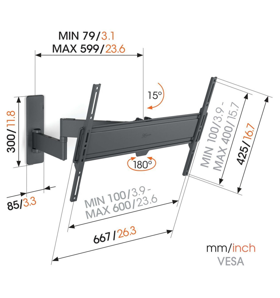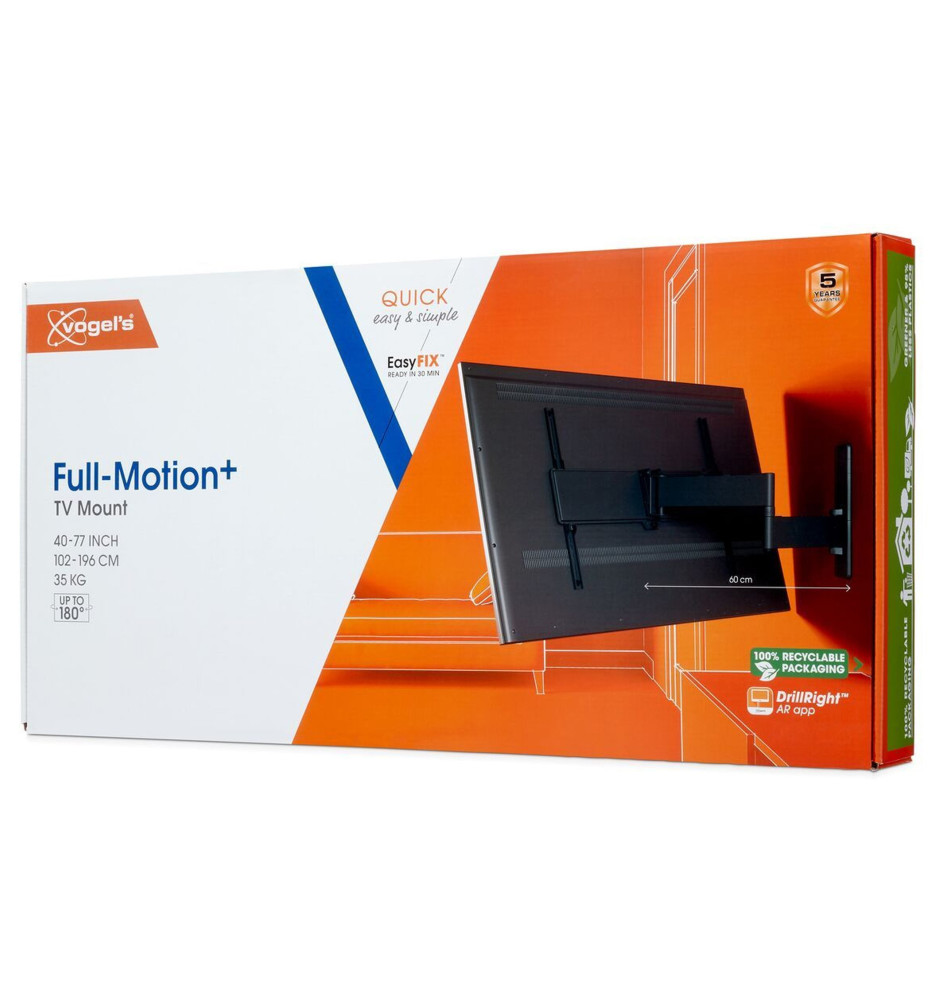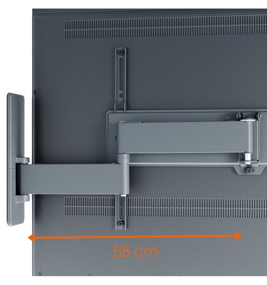 Wysokiej jakości uchwyt ścienny z serii Quick z długim, 58-centymetrowym ramieniem o szerokim zakresie regulacji, dedykowany do większych telewizorów o przekątnej ekranu od 40" do 77" oraz wadze do 35kg. Pozwala na pełne, płynne obrócenie ekranu w zakresie do 180° oraz jego pochylenie do 15°.