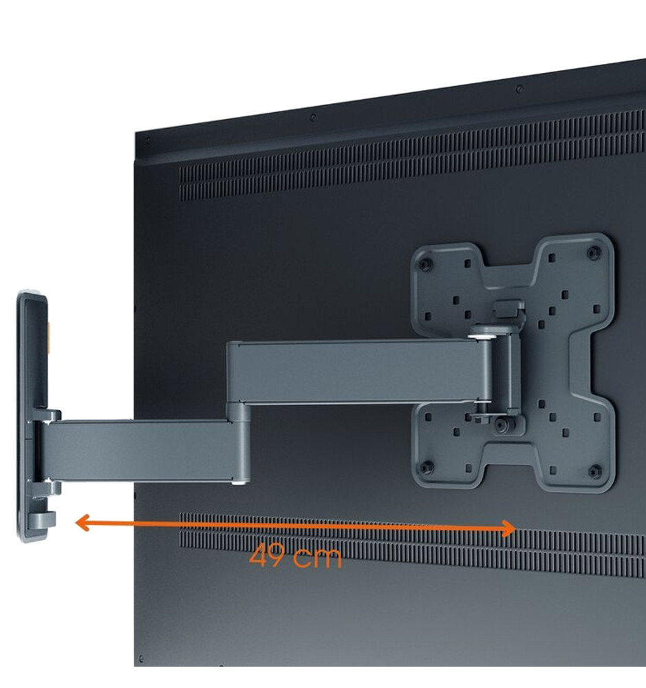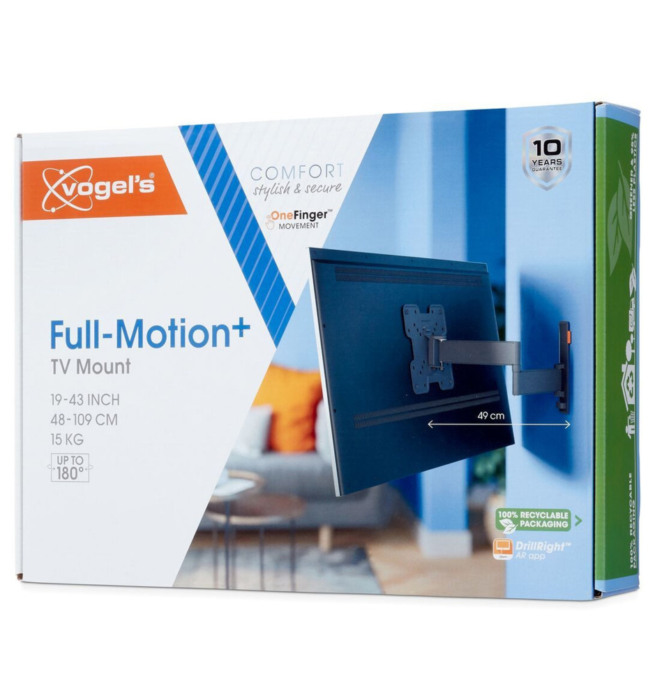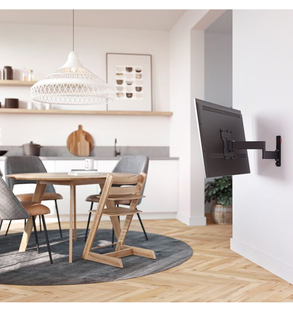 Stylowy i wytrzymały uchwyt ścienny typu Full-Motion+ z serii Comfort z długim ramieniem o szerokim zakresie regulacji obrotu i pochylenia, dedykowany do mniejszych telewizorów o przekątnej ekranu od 19" do 43" i wadze do 15 kg.