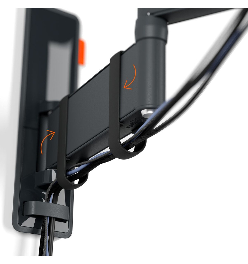 TVM 3243 jest regulowanym uchwytem OneFinger™ Movement, który dzięki specjalnym łożyskom, oferuje możliwość pochylenia ekranu w zakresie od -10° do +10° oraz bezwysiłkowego, płynnego obrotu do 180°. Dołączony klips pozwala na wygodne poprowadzenie i przymocowanie przewodów do ramienia.