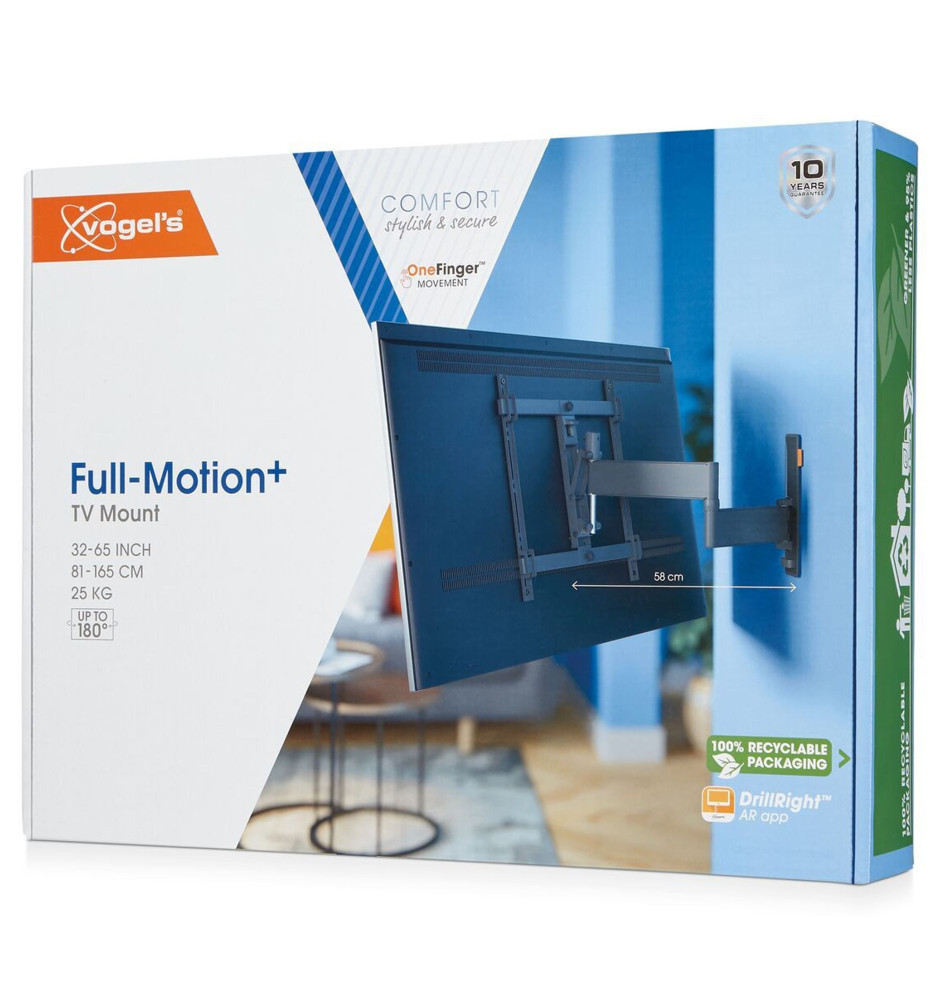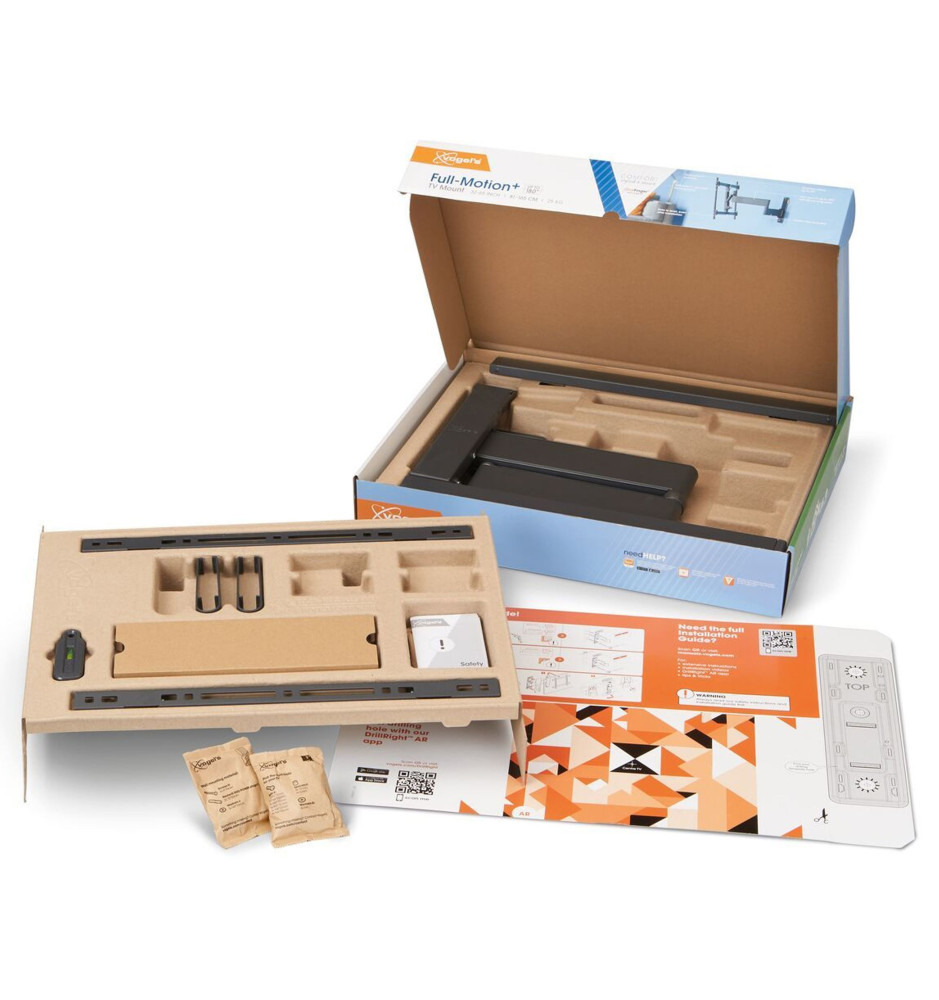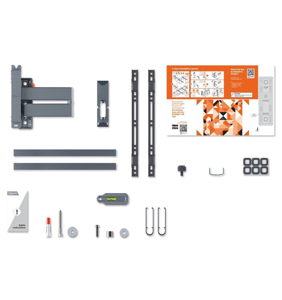 Uchwyt ścienny TVM 3443 z łatwością zainstalujesz samodzielnie, ponieważ w zestawie znajdują się: szablon do wiercenia, śruby, kołki Fischer® DuoPower, opaski kablowe oraz poziomica. Aby wyznaczyć pierwszy otwór, wystarczy skorzystać z bezpłatnej aplikacji DrillRight™ AR. Zwięzłe i jasne instrukcje dotyczące instalacji można znaleźć w dołączonej krótkiej instrukcji.