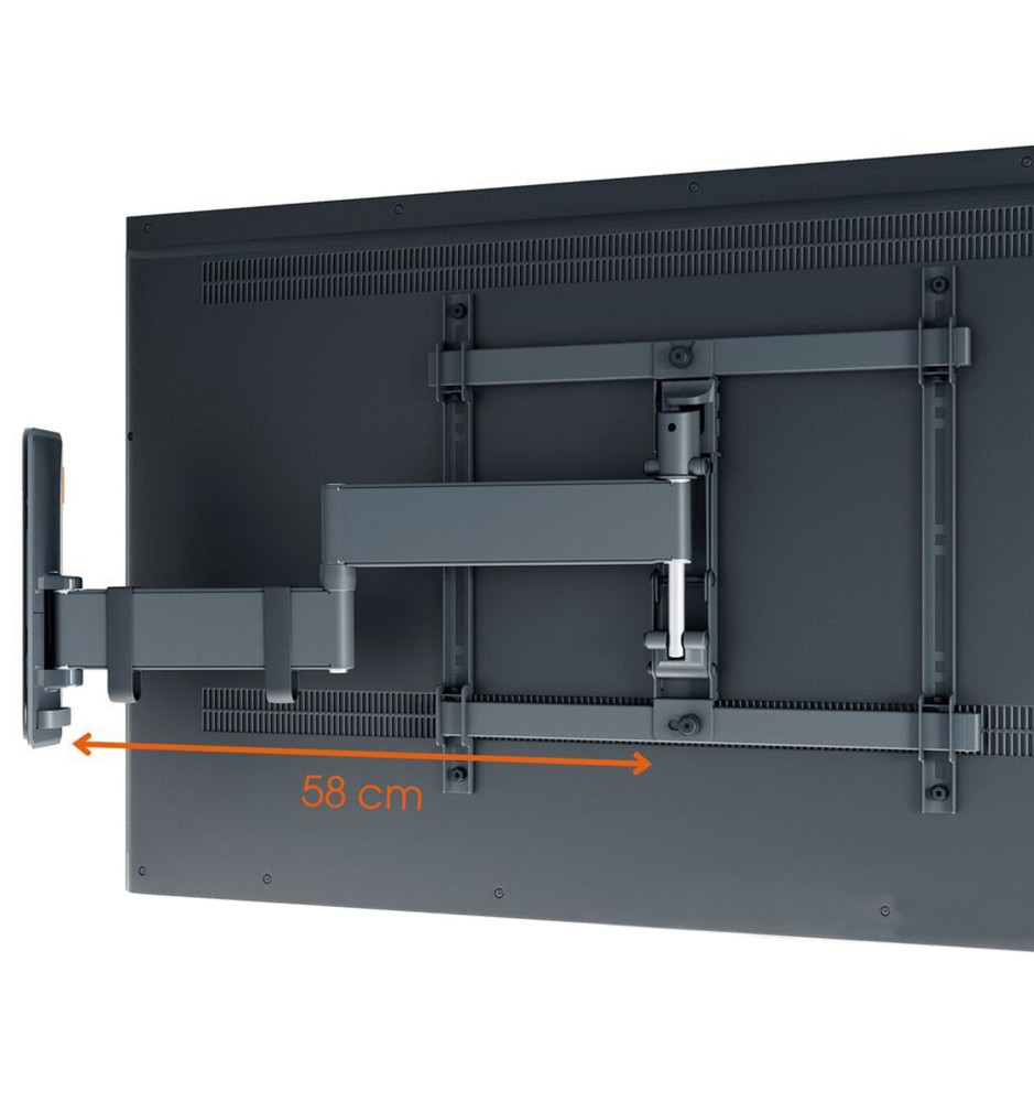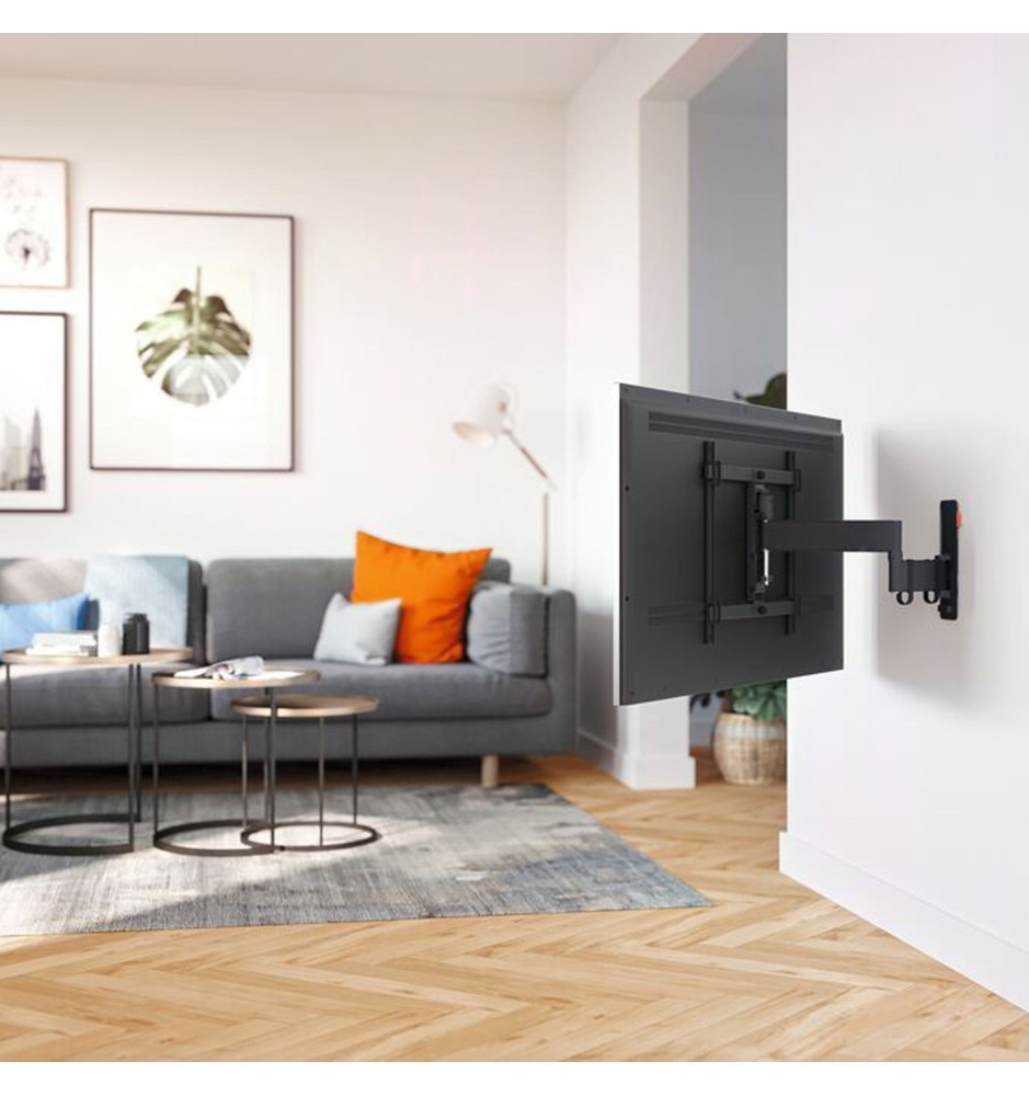 Aby umożliwić optymalne ustawienie obrazu telewizora, uchwyt TVM 3443 wyposażono w ramię z trzema punktami obrotowymi o zakresie 180 stopni oraz gładkim mechanizmem OneFinger™, dzięki któremu można nie tylko łatwo obrócić ekran, ale również dostosować jego odległość od ściany. Dodatkowo uchwyt posiada system TiltAnchor™ umożliwiający łatwą regulację pochylenia ekranu w zakresie 20 stopni.