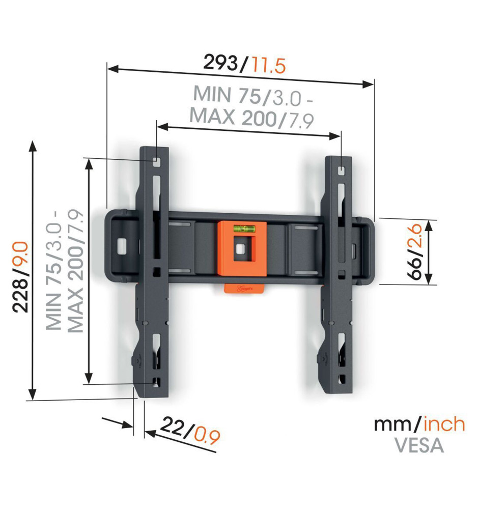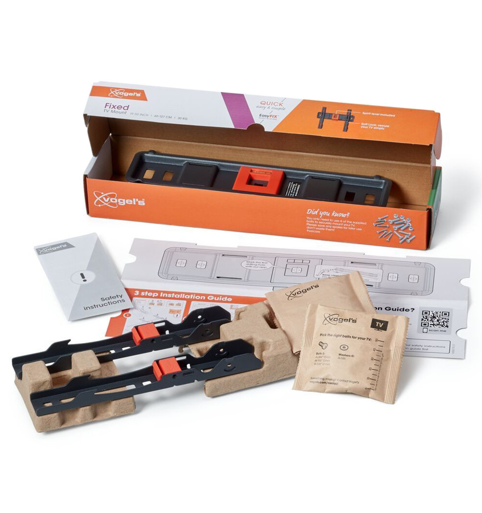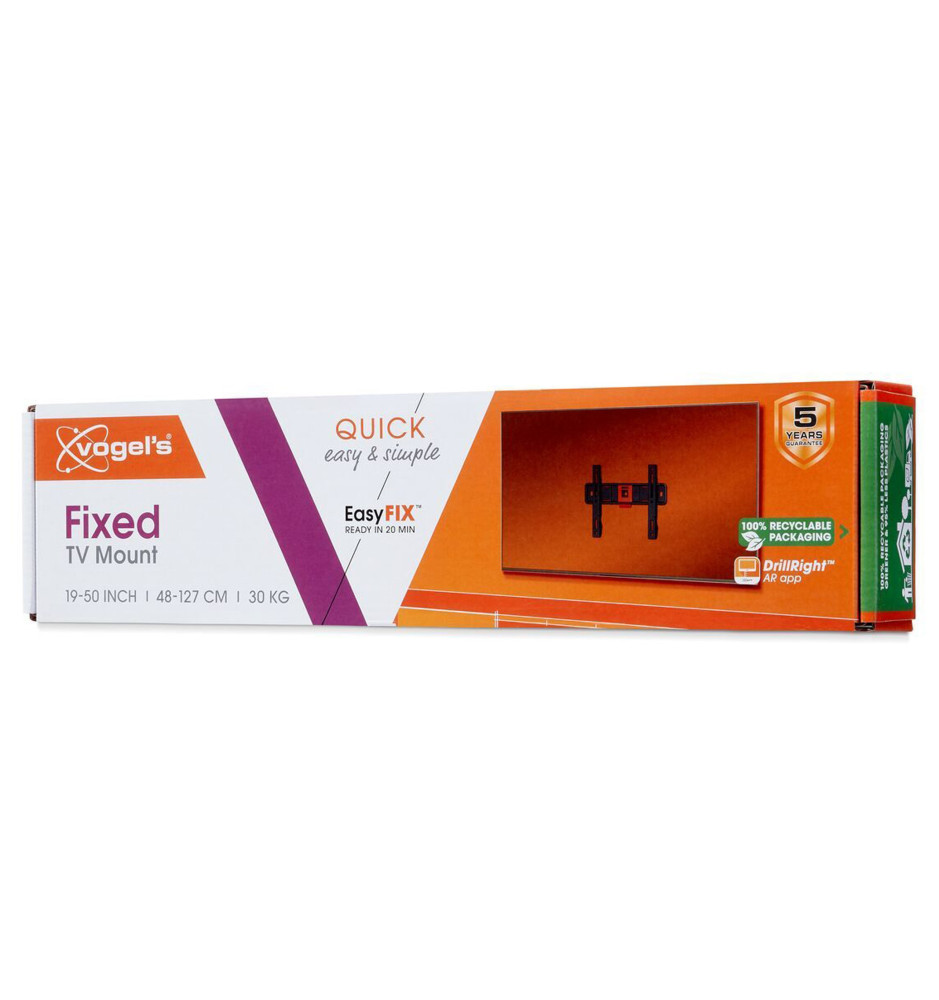 Wysokiej jakości stały, płaski uchwyt ścienny z serii Quick, dedykowany do telewizorów o przekątnej ekranu od 19" do 50" i wadze do 30kg. Zapewnia zaledwie 22mm odstępu ekranu od ściany i posiada w zestawie niezbędne akcesoria instalacyjne, w tym szablon montażowy oraz śruby i kołki Fischer® DuoPower.