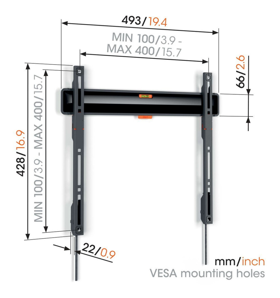 Wysokiej jakości stały, płaski uchwyt ścienny do telewizorów o przekątnej ekranu od 32" do 77" i wadze do 50kg, zapewniający zaledwie 22mm odstępu ekranu od ściany oraz wyposażony w niezbędne akcesoria instalacyjne.