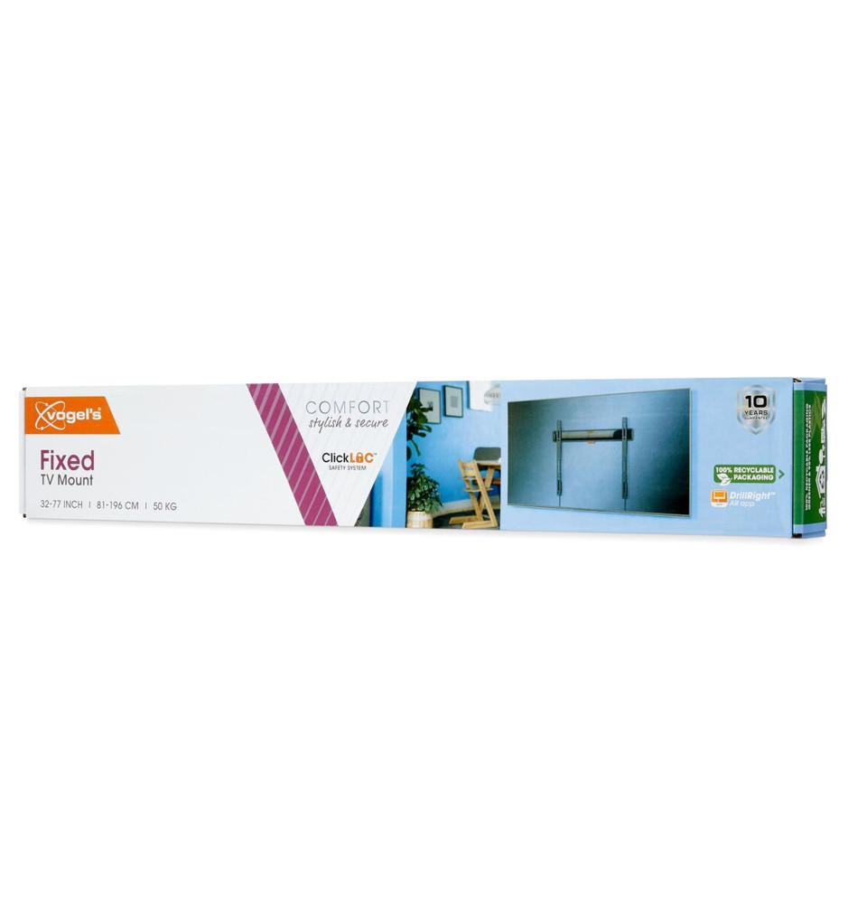 Wysokiej jakości stały, płaski uchwyt ścienny do telewizorów o przekątnej ekranu od 32" do 77" i wadze do 50kg, zapewniający zaledwie 22mm odstępu ekranu od ściany oraz wyposażony w niezbędne akcesoria instalacyjne. Darmowa aplikacja DrillRight™ AR App na urządzenia mobilne oraz zintegrowana poziomica dodatkowo ułatwią montaż uchwytu na ścianie.