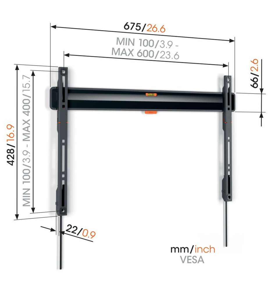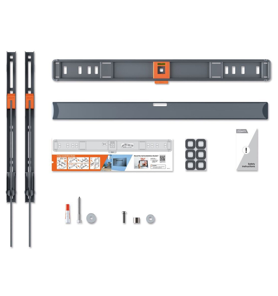 Wysokiej jakości stały, płaski uchwyt ścienny do dużych telewizorów o przekątnej ekranu od 40" do 100" i wadze do 75kg, zapewniający zaledwie 22mm odstępu ekranu od ściany oraz wyposażony w niezbędne akcesoria instalacyjne.