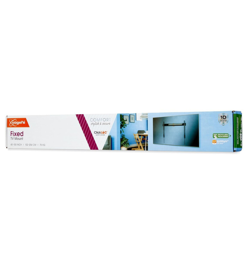 Wysokiej jakości stały, płaski uchwyt ścienny do dużych telewizorów o przekątnej ekranu od 40" do 100" i wadze do 75kg, zapewniający zaledwie 22mm odstępu ekranu od ściany oraz wyposażony w niezbędne akcesoria instalacyjne. Darmowa aplikacja DrillRight™ AR na urządzenia mobilne oraz zintegrowana poziomica dodatkowo ułatwią montaż uchwytu na ścianie.