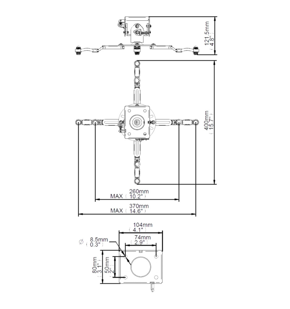 Zastosowanie sprawdzonych rozwiązań i solidnych materiałów pozwoliło na skonstruowanie uniwersalnego uchwytu pasującego do większości projektorów dostępnych na rynku, wykorzystujących mocowania M2.5, M3, M4, M5 i M6. Pełna regulacja pozwala na ustawienie odpowiedniego kąta nachylenia (+/- 13 stopni) oraz obrotu projektora o 360 stopni.
