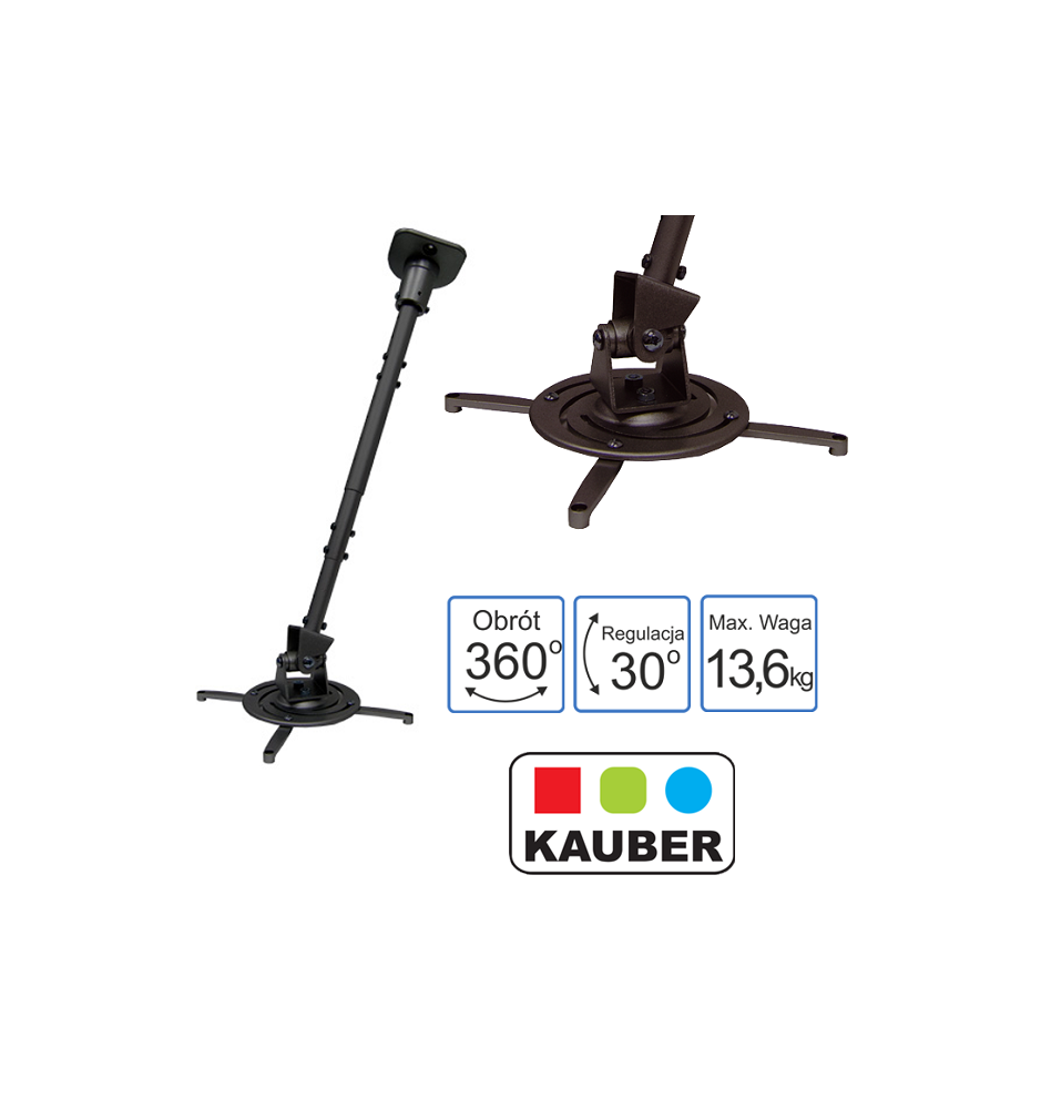 Uchwyt PRO1 Plus marki Kauber to wysokiej jakości uniwersalny uchwyt przeznaczony do montażu projektorów multimedialnych na suficie w domowych instalacjach kina, biurach i salach konferencyjnych. Posiada możliwość regulacji kąta nachylenia w dwóch płaszczyznach ok. 30°, możliwość obrotu o 360° oraz dostosowania długości ramienia od 22,5 do 113 cm.