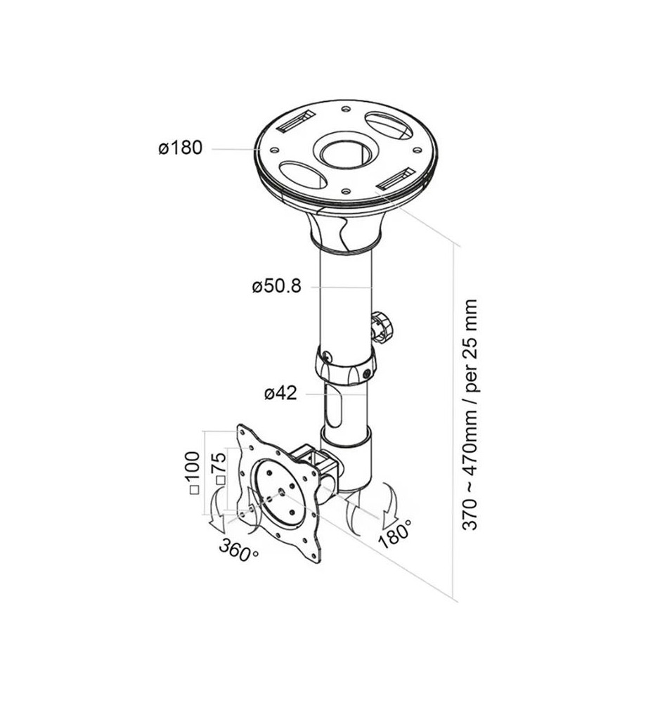 Wysokość uchwytu można zmieniać w zakresie od 37 do 47 cm. Regulacja pochylenia w zakresie 180° pozwala na optymalne dostosowanie kąta widzenia oraz montaż na skośnym suficie. Dodatkowo ekranem można rotować w pełnym zakresie 360°. Uchwyt jest odpowiedni dla ekranów zgodnych z układem otworów VESA 75x75 i 100x100 mm.