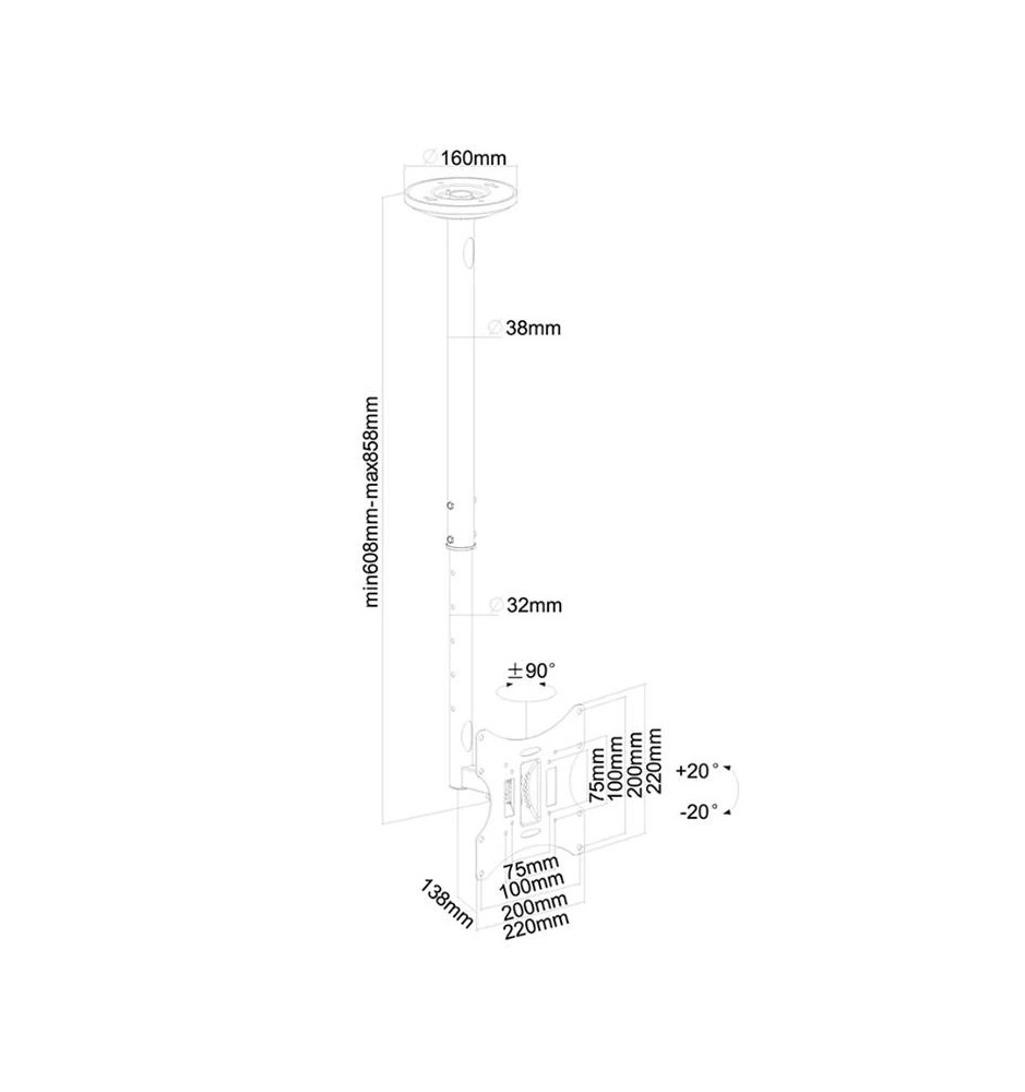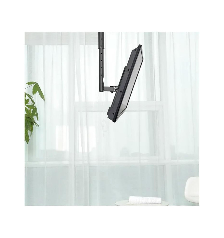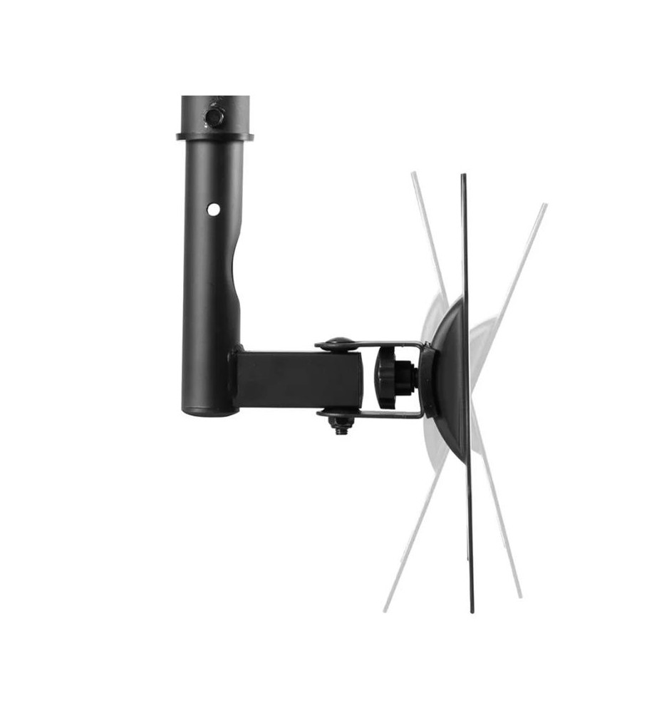 Wysokość uchwytu można zmieniać w zakresie od 60 do 85 cm. Regulacja pochylenia w zakresie 40° pozwala na optymalne dostosowanie kąta widzenia oraz montaż także na skośnym suficie. Dodatkowo zamontowany ekran można regulować w poziomie do 180°, co daje możliwość lepszego dopasowania go względem odbiorców. Uchwyt jest odpowiedni dla ekranów zgodnych z układem otworów VESA w zakresie od 75x75 do 200x200 mm.