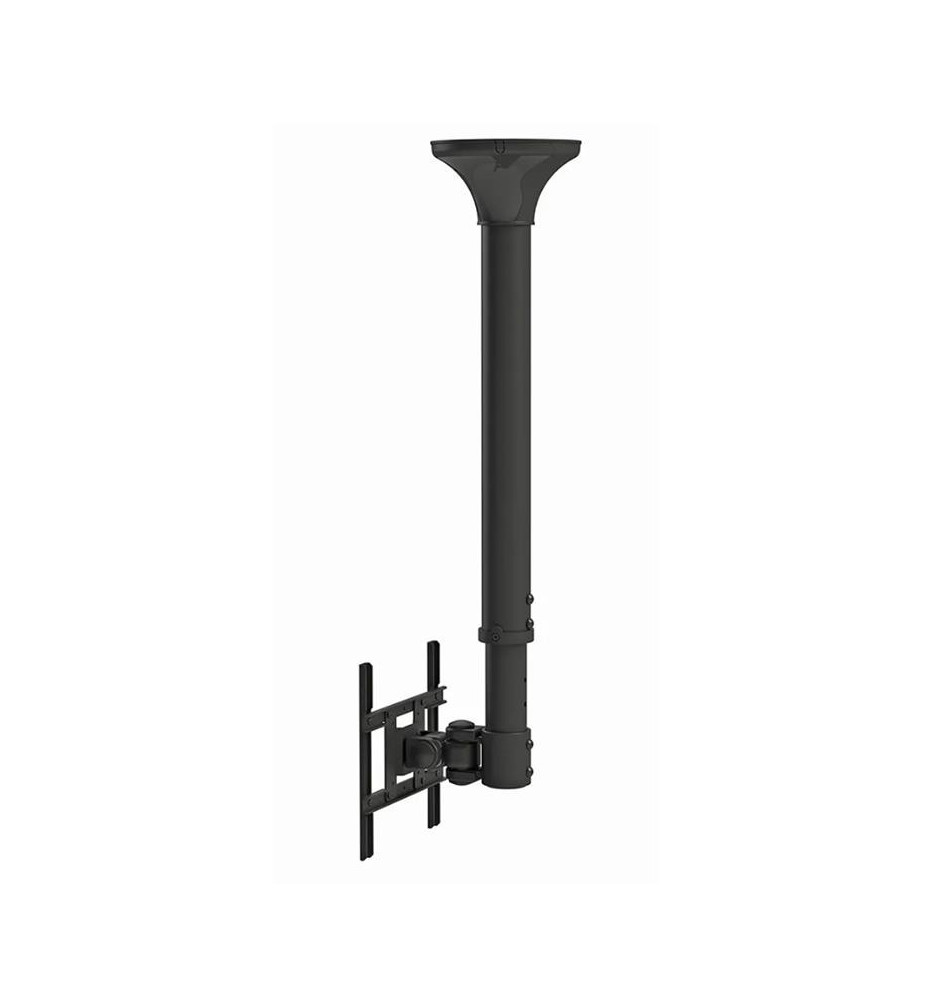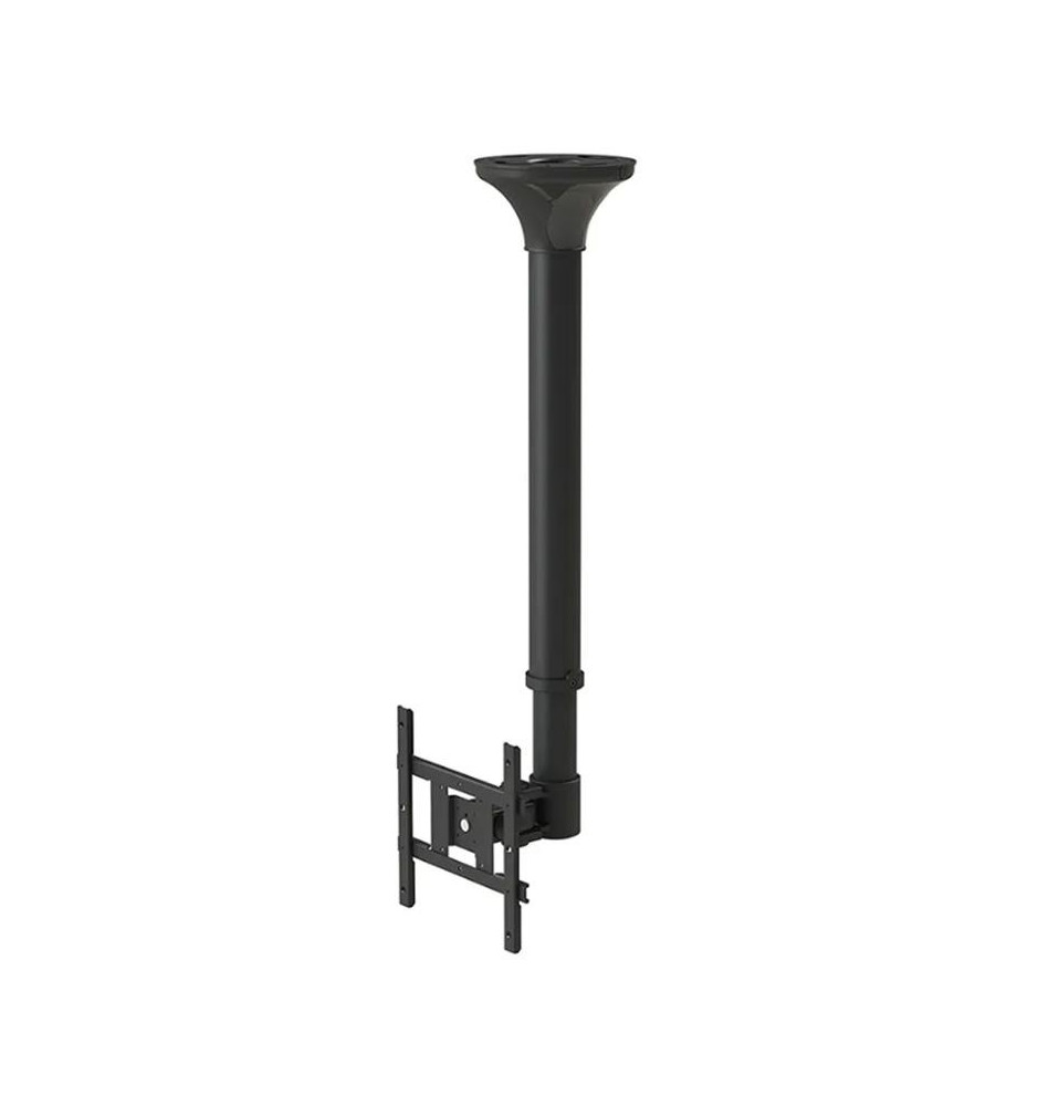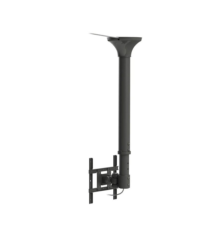 Uchwyt sufitowy o regulowanej wysokości przeznaczony do monitora lub telewizora. Kompatybilny z ekranami o przekątnej od 10" do 40". Konstrukcja z regulacją wysokości i pochylenia umożliwia optymalne ustawienie ekranu oraz montaż na skośnym suficie. System zarządzania przewodami pozwala na ukrycie kabli i poprowadzenie ich od sufitu do telewizora. Do produktu dołączone są wszystkie niezbędne akcesoria instalacyjne.