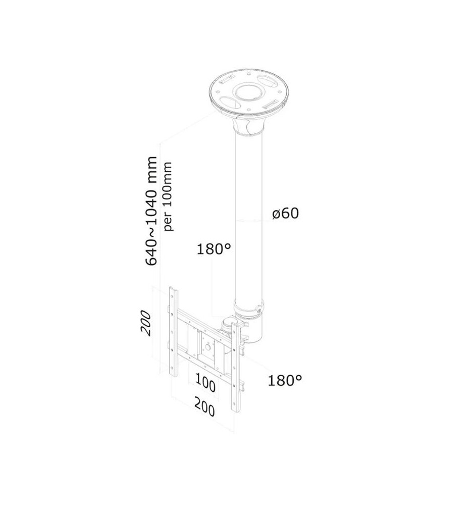 Wysokość uchwytu poddaje się regulacji w zakresie od 64 do 104 cm. Regulacja pochylenia w zakresie 180° pozwala na optymalne dostosowanie kąta widzenia oraz montaż także na skośnym suficie. Dodatkowo zamontowany ekran można regulować w poziomie do 180° oraz rotować nim w pełnym zakresie 360°. Uchwyt jest odpowiedni dla ekranów zgodnych z układem otworów VESA w zakresie od 75x75 do 200x200 mm.