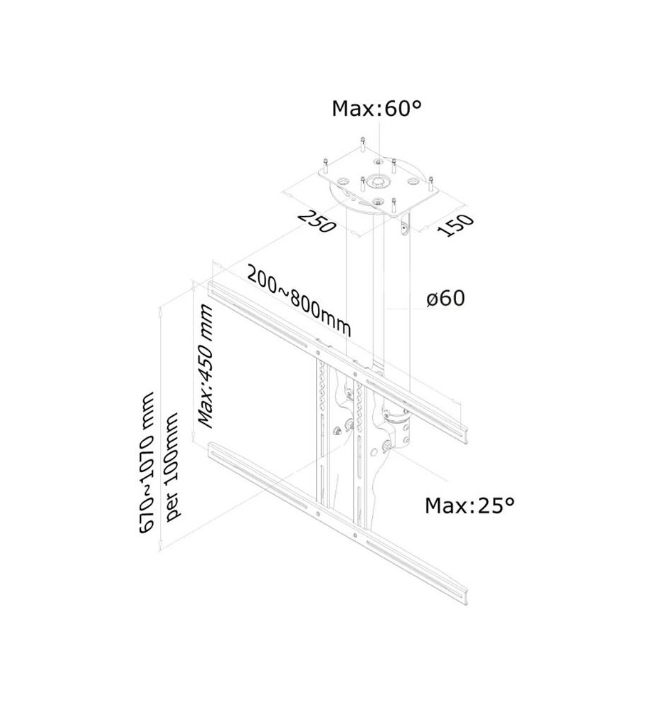 Wysokość uchwytu poddaje się regulacji w zakresie od 67 do 107 cm. Regulacja wychylenia w zakresie 25° pozwala na optymalne dostosowanie kąta widzenia oraz montaż także na skośnym suficie. Dodatkowo zamontowany ekran można regulować w poziomie do 60°. Uchwyt jest odpowiedni dla ekranów zgodnych z układem otworów VESA w dużym zakresie mieszczącym się od 200x200 do 800x400 mm.