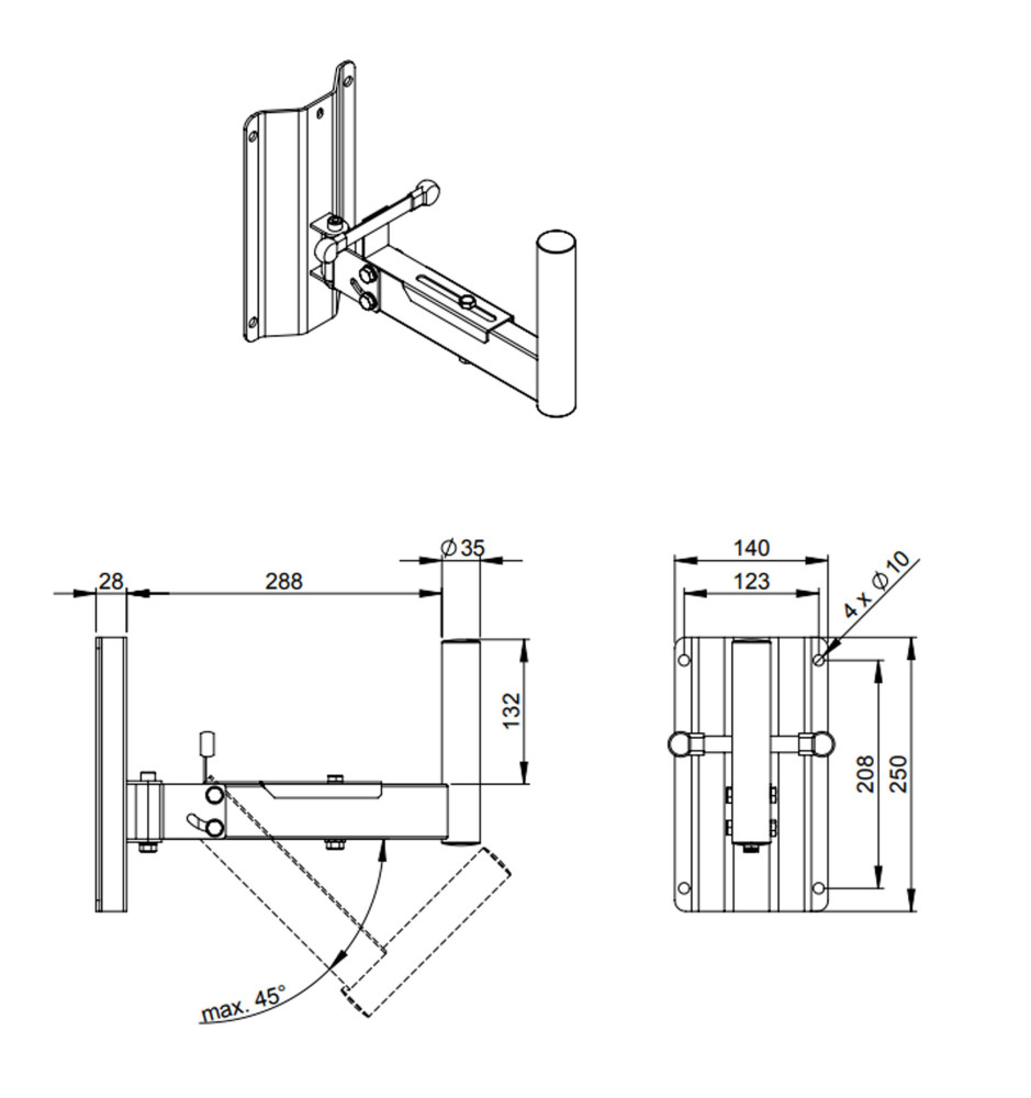 Model uchwytu SMBS 5 może zostać zainstalowany na ścianie oraz na słupku o średnicy 35 mm. Jego konstrukcja pozwala na regulację kąta wychylenia w zakresie od 0 do 45º. Dla optymalnego i maksymalnie bezpiecznego montażu głośnika zaleca się dodatkowo wykorzystanie linki zabezpieczającej oraz śrub o odpowiedniej wytrzymałości na naprężenia.