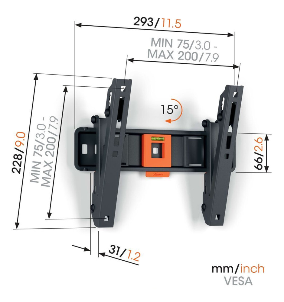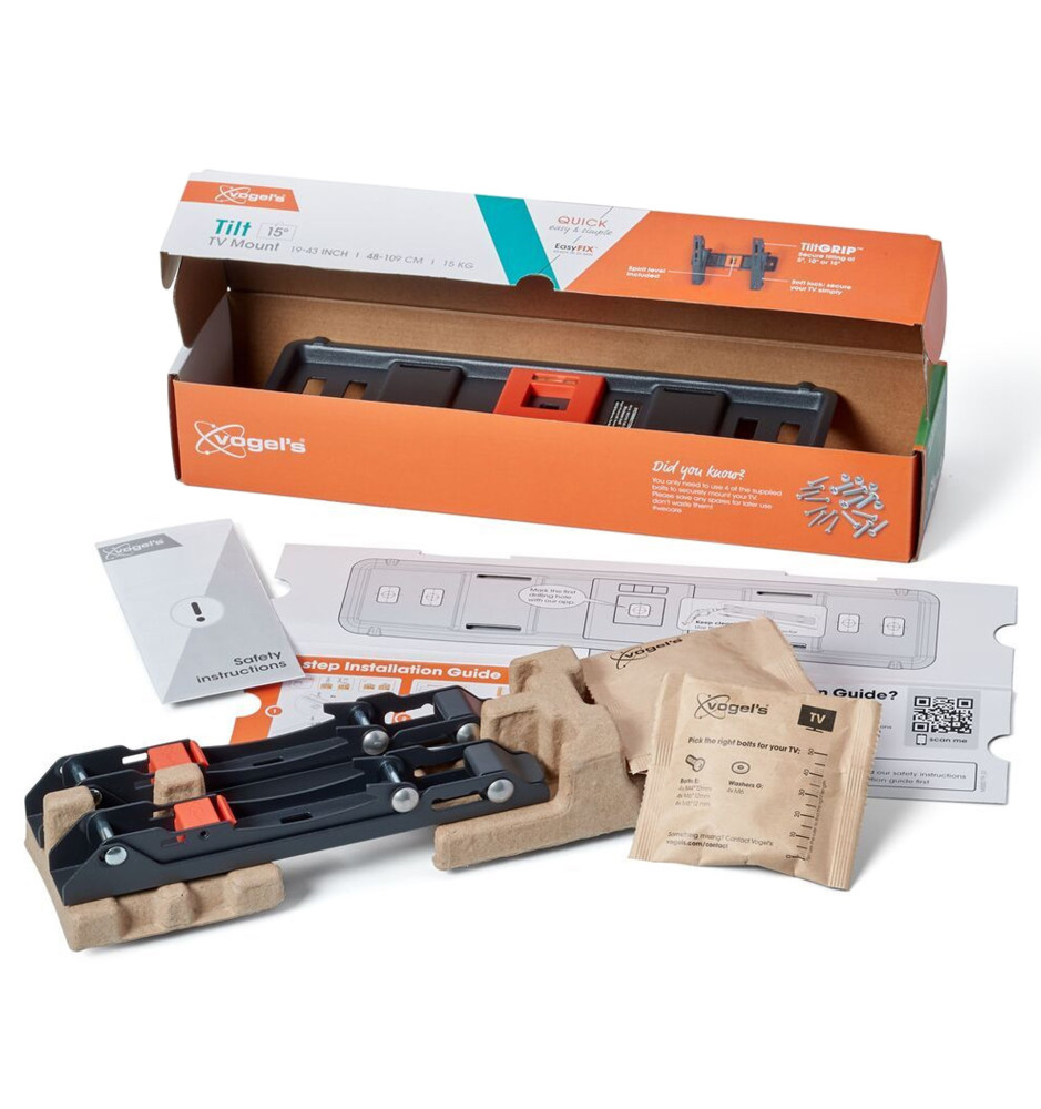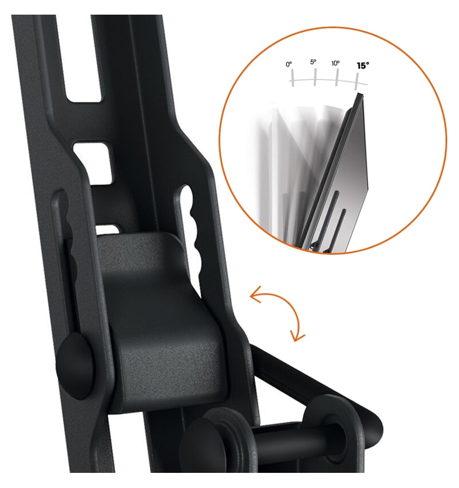 Wysokiej jakości uchwyt ścienny z serii Quick, wyposażony w bezpieczną regulację pochylenia 5°, 10° lub 15° i dedykowany do telewizorów o przekątnej ekranu od 19" do 43" oraz wadze do 15kg.